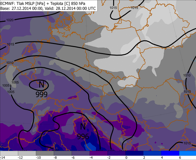 Obr. 1 - Predpoveď teploty vzduchu v hladine 850 hPa (výška cca 1400 m) a prízemného tlakového poľa modelu ECMWF pre 30.12.2014 15:00 UTC.