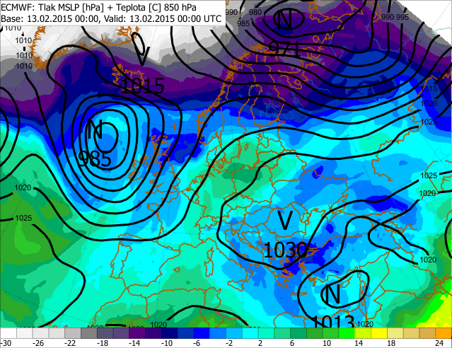 Obr. 3 - Predpoveď prízemného tlakového poľa a teploty v hladine 850 hPa (výška cca 1500 m) z modelu ECMWF, 19.2.2015 06:00 UTC.