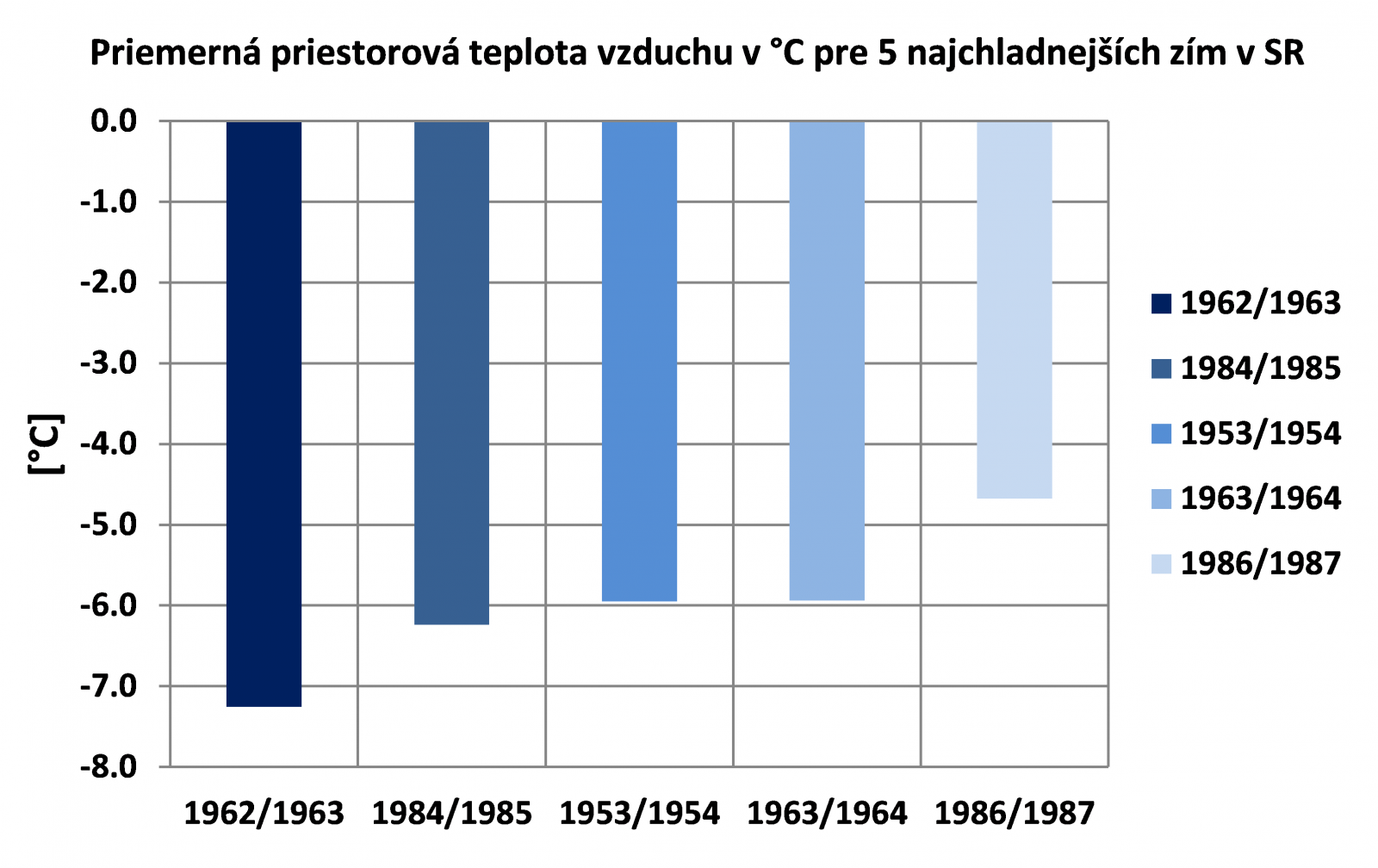 Obr.3: Priemerná priestorová teplota vzduchu v 5. najteplejších a v 5. najchladnejších zimách od polovice 20. storočia
