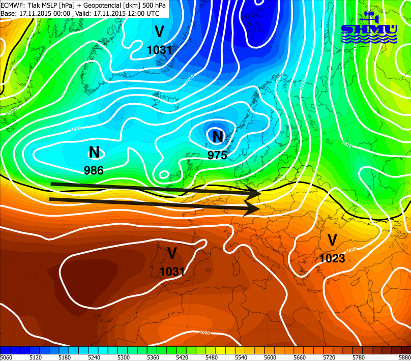 Obr. 1 - Predpoveď prízemného tlakového poľa a geopotenciálu hladiny 500 hPa pre 17.11.2015 12:00 UTC z modelu ECMWF, čierne šípky predstavujú frontálnu zónu, ktorá prebieha z Atlantického oceánu až do strednej Európy (animácia).