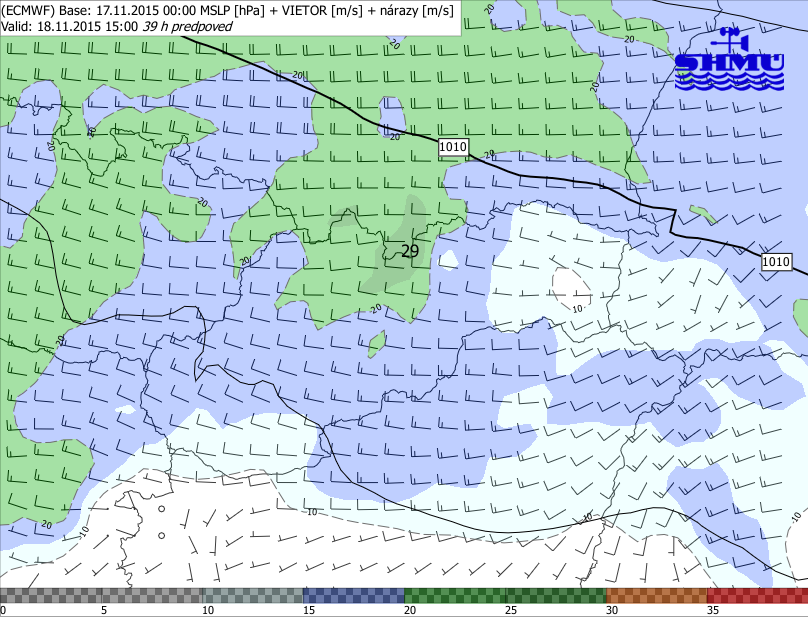 Obr. 4 - Predpoveď nárazov vetra pre 18.11.2015 15:00 UTC z modelu ECMWF (animácia).