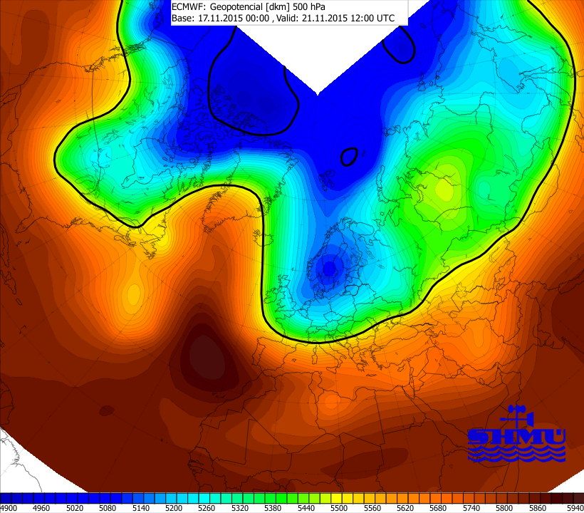 Obr. 3 - Predpoveď geopotenciálu hladiny 500 hPa pre 21.11.2015 12:00 UTC z modelu ECMWF (animácia).