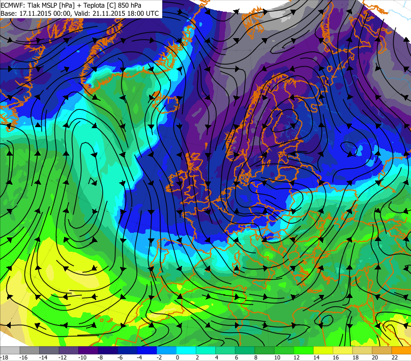 Obr. 2 - Predpoveď teploty a prúdenia v hladine 850 hPa pre 21.11.2015 18:00 UTC z modelu ECMWF (animácia).