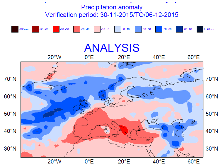 Situácia je nezvyčajná aj pre Stredomorie. Totiž práve v tomto období (koncom jesene a začiatkom zimy) padá v oblasti veľké množstvo zrážok. More je ešte dostatočne teplé a v kontakte so studeným vzduchom sa vytvára výrazný teplotný kontrast, ktorý podporuje prehlbovanie tlakových níží a prináša výdatné zrážky. Tieto níže často prinášajú zrážky aj na naše územie. Zatiaľ sa však nič také nedeje (viz napr. výrazný deficit zrážok v prvom decembrovom týždni v južnej Európe na obr. 3). Studený, pôvodom arktický, vzduch je veľmi ďaleko (teplé počasie pretrváva aj na severe Európy) a do južnej Európy sa tak nedostáva, prípadne len prechodne a vplyvom transformácie je už podstatne teplejší. Postup studených frontov do oblasti blokuje aj pretrvávajúca tlaková výš.