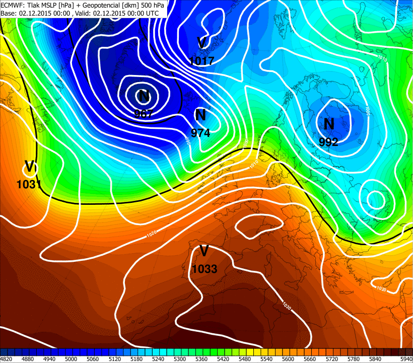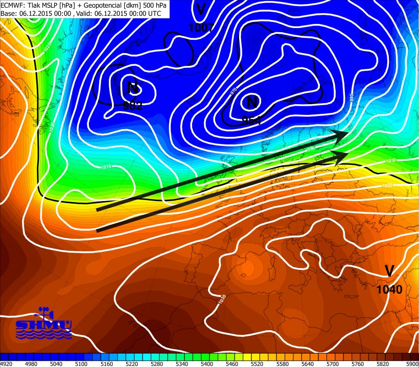 Obr. 1 - Analýza prízemného tlakového poľa a geopotenciálu hladiny 500 hPa pre 6.12.2015 00:00 UTC modelu ECMWF, čierne šípky predstavujú frontálnu zónu, ktorá prebieha z Atlantického oceánu až do Ruska (animácia).