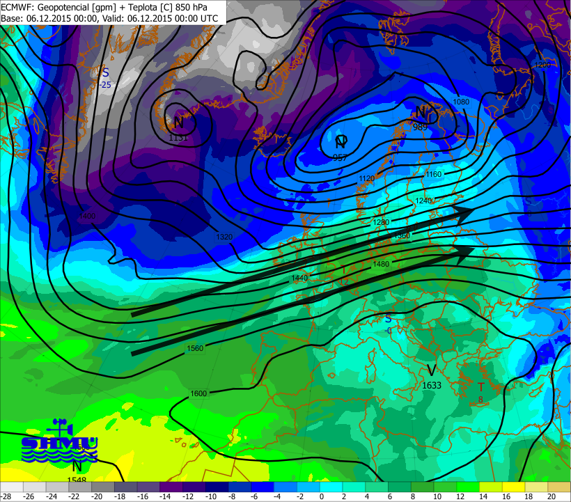 Obr. 2 - Analýza teploty a geopotenciálu hladiny 850 hPa (výška cca 1500 m n.m.) 6.12.2015 00:00 UTC modelu ECMWF, čierne šípky predstavujú prúdenie teplého vzduchu do vnútrozemia Európy.