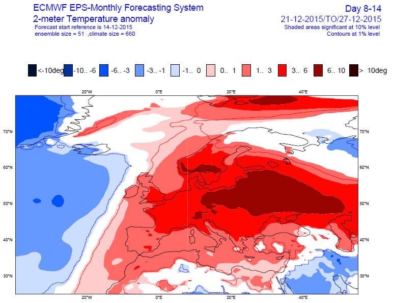 Obr. 4 - Predpoveď priemernej týždennej odchýlky teploty vzduchu vo výške 2 m od priemeru* z ECMWF pre dni 21.12. - 27.12.2015, červené farby = teplota nad priemerom, modré = teplota pod priemerom.