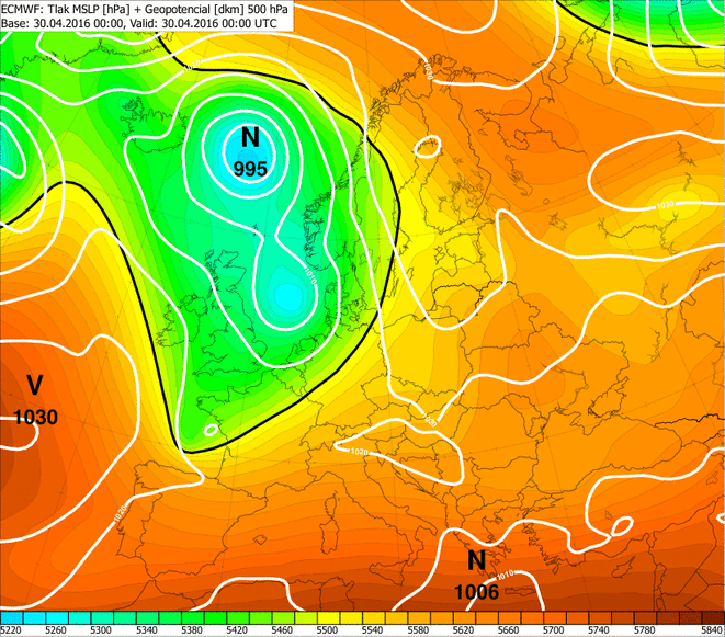 Obr. 1 - Analýza prízemného tlakového poľa (biele izočiary) a geopotenciálu hladiny 500 hPa (farebná škála) 4.5.2016 06:00 UTC z modelu ECMWF. Písmená označujú výškové tlakové níže v hladine 500 hPa (ang. cut-off/cut-off low).