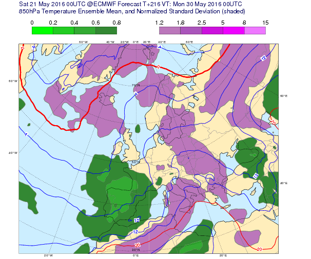Obr. 2: Výstup z ansámblovej (pravdepodobnostnej) predpovede teploty vzduchu v hladine 850 hPa z modelu ECMWF na pondelok 30.5.2016 o 00 UTC (Pozn.: Kontúry modrej, resp. červenej farby predstavujú strednú hodnotu ansámblu, farebné plochy v odtieňoch zelenej a fialovej normalizovanú štandardnú odchýlku.)