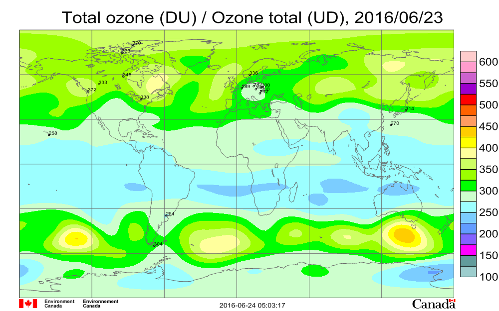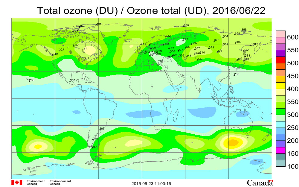 Denný celkový ozón  23.6.2016 . Družicové merania - družica NOAA  TIROS s prístrojom TOVS, body s vyčíslenými hodnotami predstavujú pozemné merania celkového ozónu Brewerovými spektrofotometrami. zdroj: http://exp-studies.tor.ec.gc.ca/e/ozone/Curr_allmap_g.htm