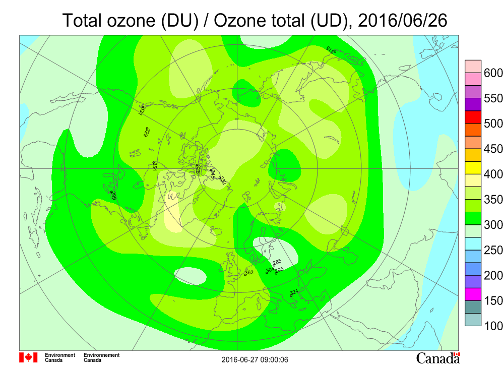 Celkový ozón v Poprade-Gánovciach 26.6.2016  282,4 - 315,0  DU,  o 13 - 20 % nižšie hodnoty v porovnaní s dlhodobým priemerom.