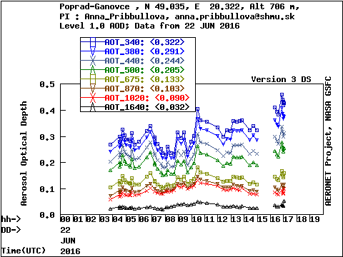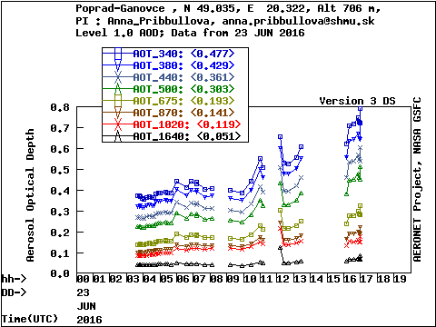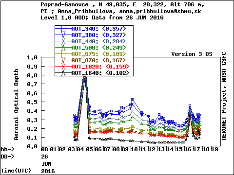 Optická hrúbka aerosólu pre vlnovú dĺžku žiarenia 340 nm (UV) meraná v Poprade-Gánovciach 24.6.6.2016    0,489, 25.6.6.2016    0,376,  26.6.6.2016    0,357