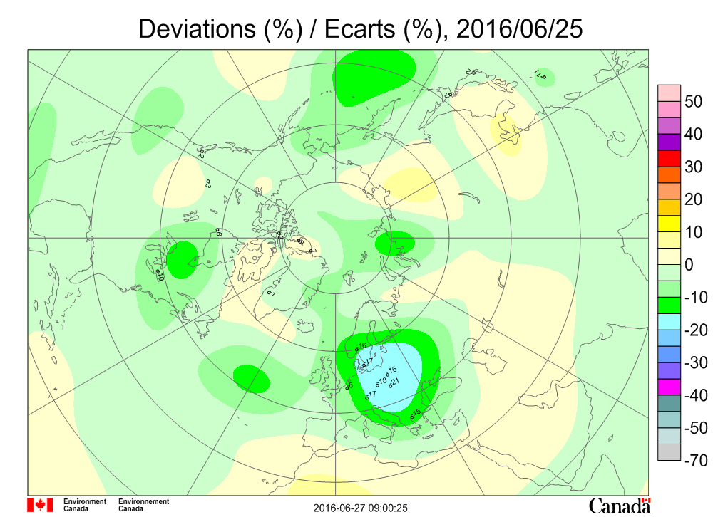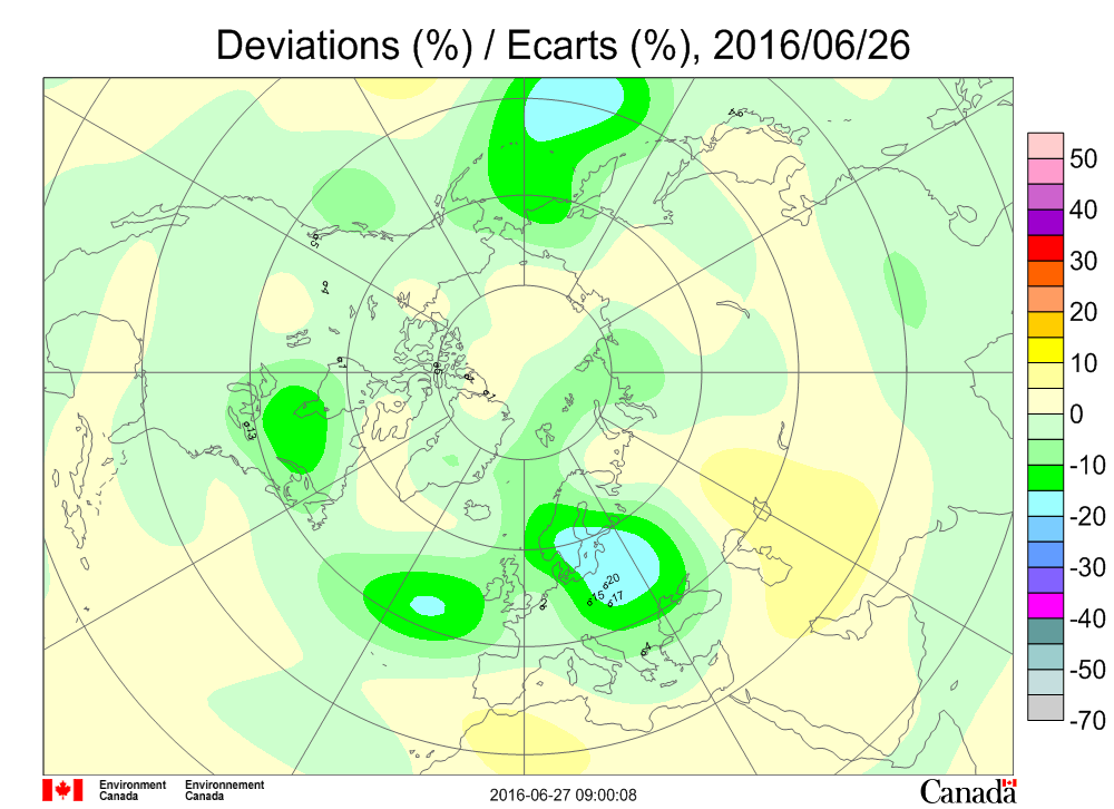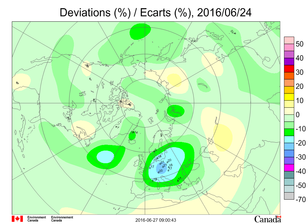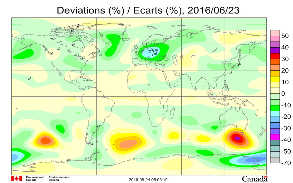 Odchýlky denného celkového ozónu pre 22.6.2016 od priemeru vypočítaného za obdobie 1978 -1988 . Družicové merania - družica NOAA  TIROS s prístrojom TOVS, body s vyčíslenými odchýlkami predstavujú pozemné merania celkového ozónu Brewerovými spektrofotometrami. zdroj: http://exp-studies.tor.ec.gc.ca/e/ozone/Curr_allmap_g.htm
