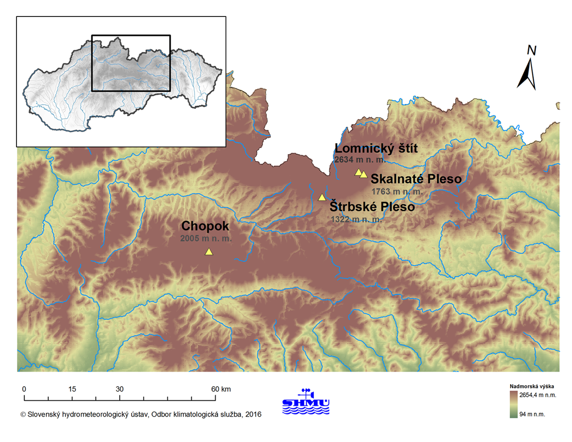 V polovici júla 2016 napadal v Alpách sneh aj na miestach s nadmorskou výškou nižšou ako 2000 m. Výskyt snehovej pokrývky v týchto polohách Álp v období vrcholného leta môže niekoho prekvapiť, ale stáva sa to tam v tomto ročnom období pomerne pravidelne (aj keď v tomto roku sme v Tatrách v priebehu leta nový sneh ešte nezaznamenali). V tejto súvislosti môže byť zaujímavé, aké sú výsledky meteorologických meraní charakteristík snehovej pokrývky vo vysokohorských polohách Slovenska. Pre tento účel sme štatisticky spracovali vybrané charakteristiky snehovej pokrývky (a sneženia) zo štyroch meteorologických staníc v období od 1. júna do 31. augusta: Chopok (2005 m n. m.), Lomnický štít (2634 m n. m.), Skalnaté Pleso (1763 m n. m.) a Štrbské Pleso (1322 m n. m.; Obr. 1). V prípade Lomnického štítu a Štrbského Plesa sú k dispozícii údaje už od roku 1951, na Chopku od roku 1955 a Skalnatom Plese od roku 1961.