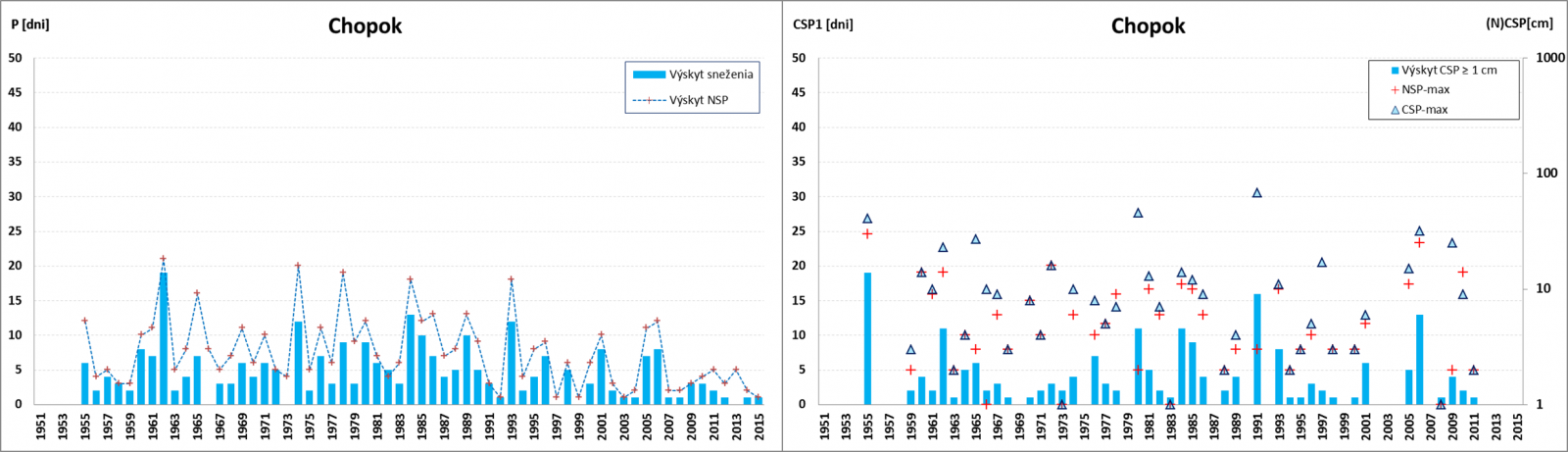 Obr. 2: (vľavo) Počet dní so snežením a novou snehovou pokrývkou (NSP) v lete (jún-august); (vpravo) počet dní s výskytom snehovej pokrývky (CSP ≥ 1 cm) a maximálny výška novej, resp. celkovej snehovej pokrývky (NSP, resp. CSP) na Chopku v období 1955-2015 (Zdroj: SHMÚ)