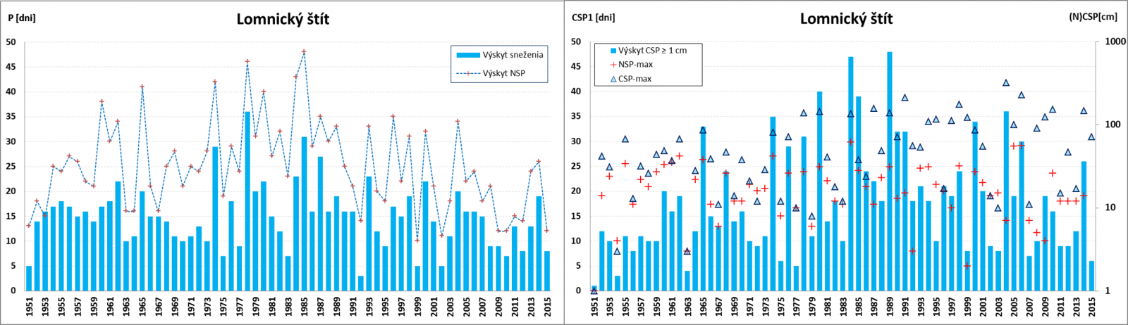 Obr. 3: (vľavo) Počet dní so snežením a novou snehovou pokrývkou (NSP) v lete (jún-august); (vpravo) počet dní s výskytom snehovej pokrývky (CSP ≥ 1 cm) a maximálna výška novej, resp. celkovej snehovej pokrývky (NSP, resp. CSP) na Lomnickom štíte v období 1951-2015 (Zdroj: SHMÚ)