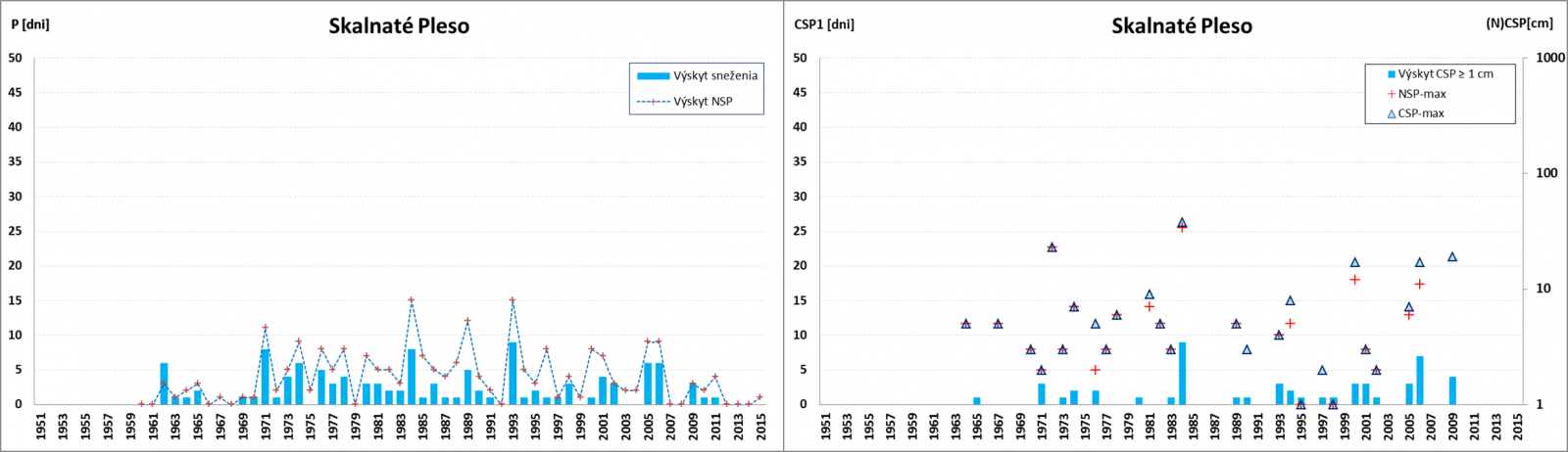 Obr. 4: (vľavo) Počet dní so snežením a novou snehovou pokrývkou (NSP) v lete (jún-august); (vpravo) počet dní s výskytom snehovej pokrývky (CSP ≥ 1 cm) a maximálna výška novej, resp. celkovej snehovej pokrývky (NSP, resp. CSP) na Skalnatom Plese v období 1961-2015 (Zdroj: SHMÚ)