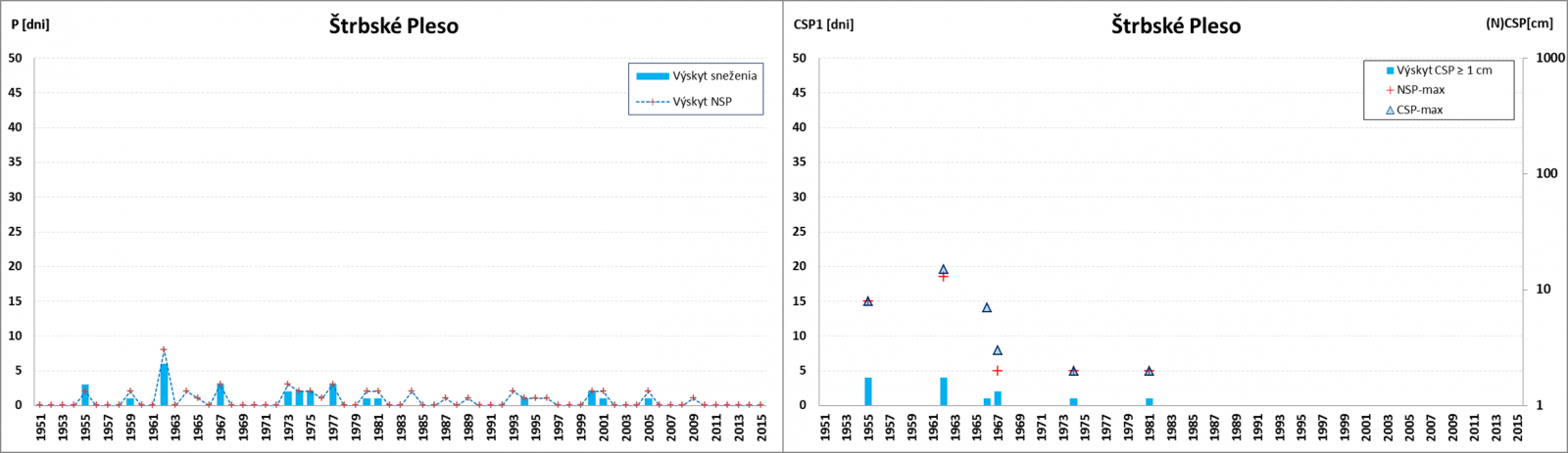 Obr. 5: (vľavo) Počet dní so snežením a novou snehovou pokrývkou (NSP) v lete (jún-august); (vpravo) počet dní s výskytom snehovej pokrývky (CSP ≥ 1 cm) a maximálny výška novej, resp. celkovej snehovej pokrývky (NSP, resp. CSP) na Štrbskom Plese v období 1951-2015 (Zdroj: SHMÚ)