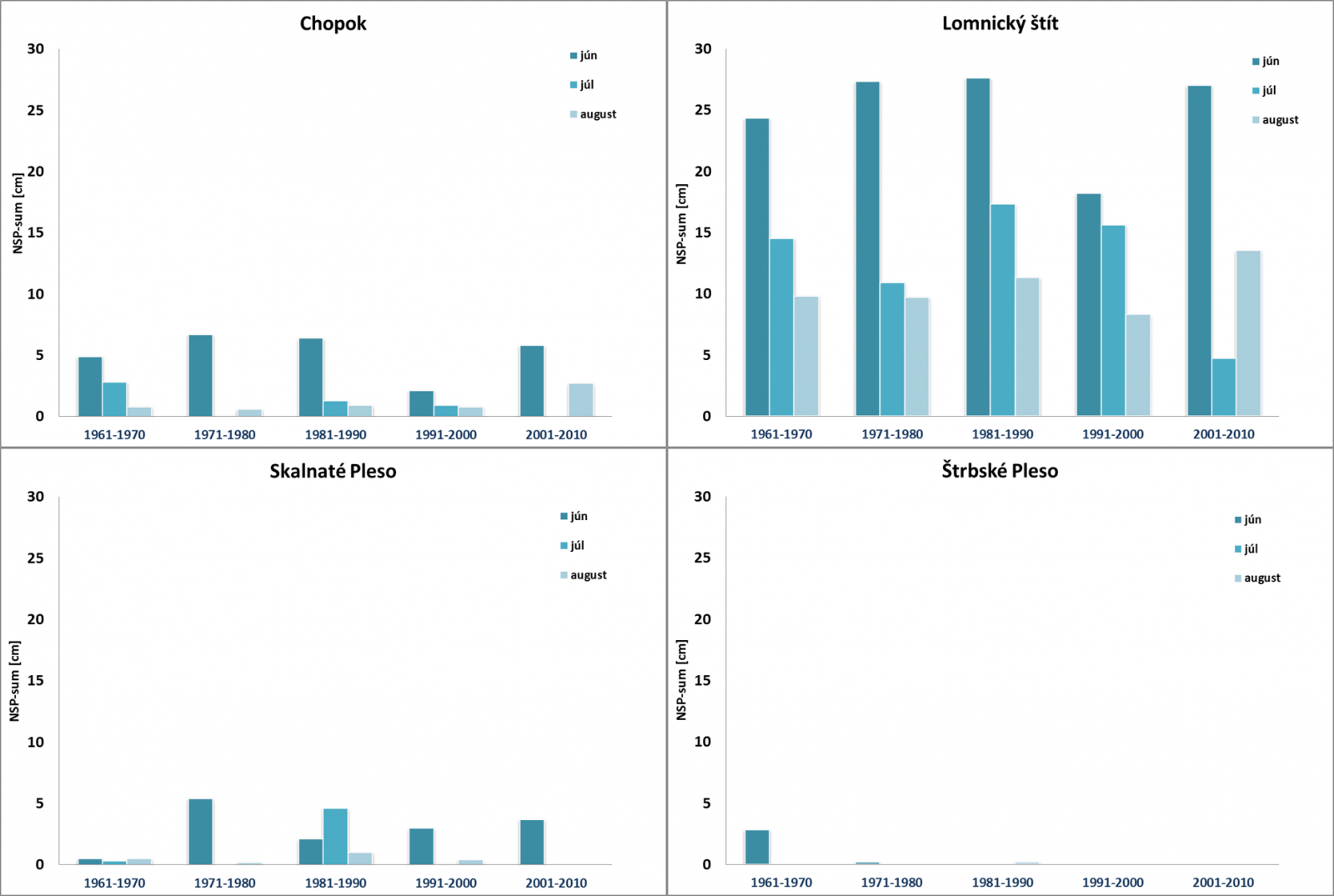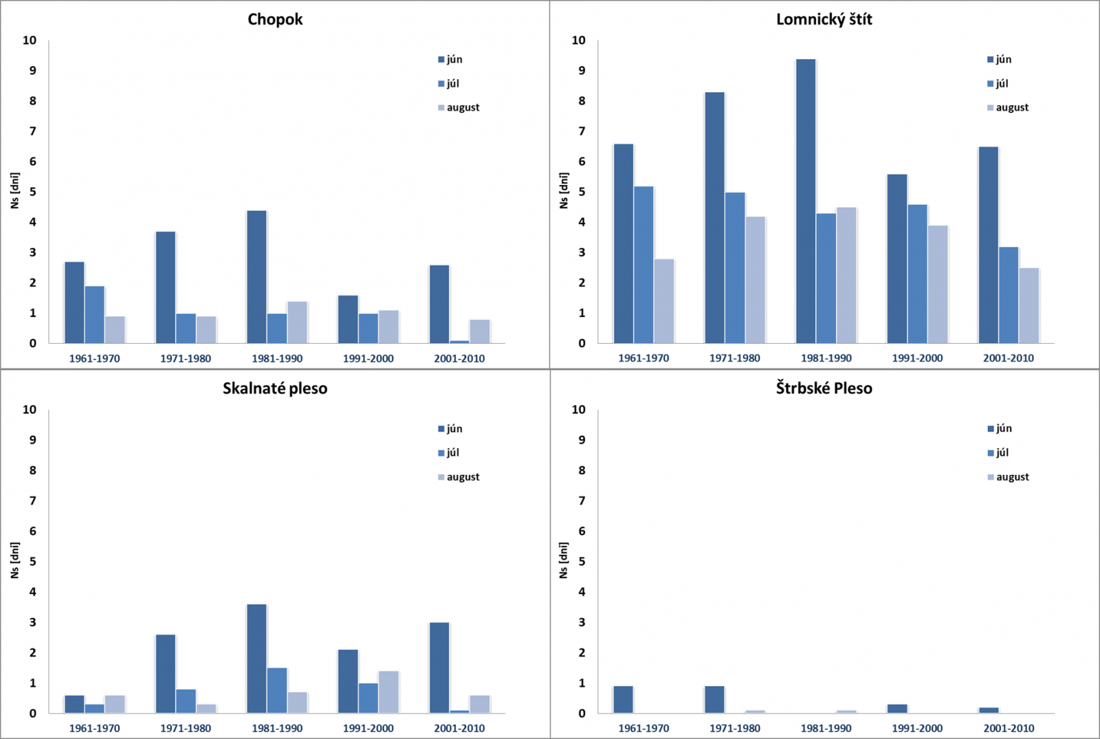 Výsledky celkom jednoznačne ukazujú, že podobne ako v Alpách, ani v našich najvyšších pohoriach nie je výskyt sneženia či snehovej pokrývky uprostred leta nič mimoriadne, aj keď súčasne je potrebné poznamenať, že tento jav sa najmä v nižšie položených častiach Tatier začína z klimatického režimu tejto oblasti pomerne rýchlo vytrácať. V najvyšších polohách Vysokých Tatier, resp. Nízkych Tatier, sa v časových radoch charakteristík snehovej pokrývky prejavuje síce aj v lete určitá stabilita (na Chopku sa napríklad vyskytne v lete v priemere 10-15 dní so snežením za rok; na Lomnickom štíte je to dokonca až 20-45 dní), no aj tu dochádza k určitým zmenám (Obr. 2-5). Zreteľnejší pokles je evidentný najmä v posledných desaťročiach pri výskyte novej snehovej pokrývky (približne od druhej polovice 80., resp. začiatku 90. rokov 20. storočia). Naopak, v prípade maximálnych hodnôt celkovej snehovej pokrývky za leto sú jej hodnoty v dekádach na konci 20. a na začiatku 21. storočia vyššie, ako pred tým (zvlášť nápadné je to v prípade Lomnického štítu; Obr. 3). Uvedený trend možno čiastočne vysvetliť významným posunom vrcholenia (maximálnej výšky) celkovej snehovej pokrývky vo vysokohorských polohách na neskoršie obdobie jari. Toto sa potom môže prejaviť aj častejším výskytom pomerne vysokých hodnôt snehovej pokrývky ešte aj na začiatku júna.