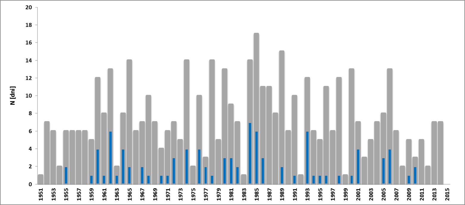 Obr. 8: Počet dní, kedy sneženie viedlo k vytvoreniu novej snehovej pokrývky s výškou aspoň 1 cm v lete na Lomnickom štíte v období 1951-2015 (sivá) a na Chopku v období 1955-2015 (modrá) (Zdroj: SHMÚ)