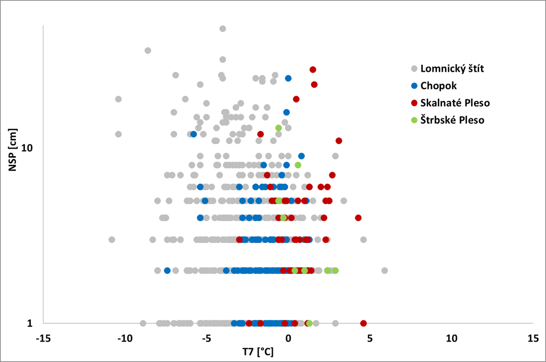 Veľmi zaujímavý pohľad ponúka aj Obr. 9, kde je zobrazený štatistický vzťah medzi priemernou dennou teplotou vzduchu (a teplotou o 7. hod ráno) a výškou novej snehovej pokrývky. Aj napriek tomu, že korelačný vzťah je pomerne voľný a všeobecne platí, že väčšina dní s novým snehom sa vyskytuje pri teplotách okolo 0 °C, predsa len je zaujímavé, že najmä v prípade nižšie položených staníc (Skalnaté a Štrbské Pleso) sa úhrny nového snehu môžu vyskytovať aj pri teplotách nad 0 °C (výnimočne aj okolo 5 °C; na tomto mieste sme chceli upozorniť na posun distribácie prípadov NSP k vyšším teplotám na staniciach Štrbské a Skalnaté Pleso).
