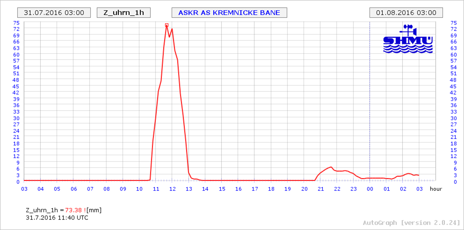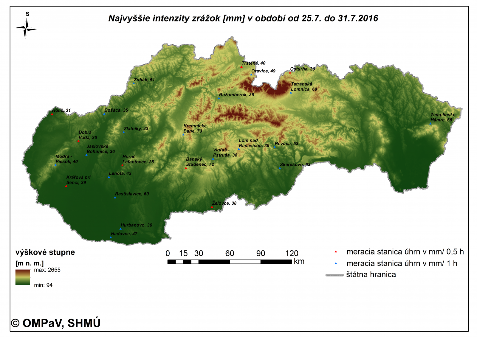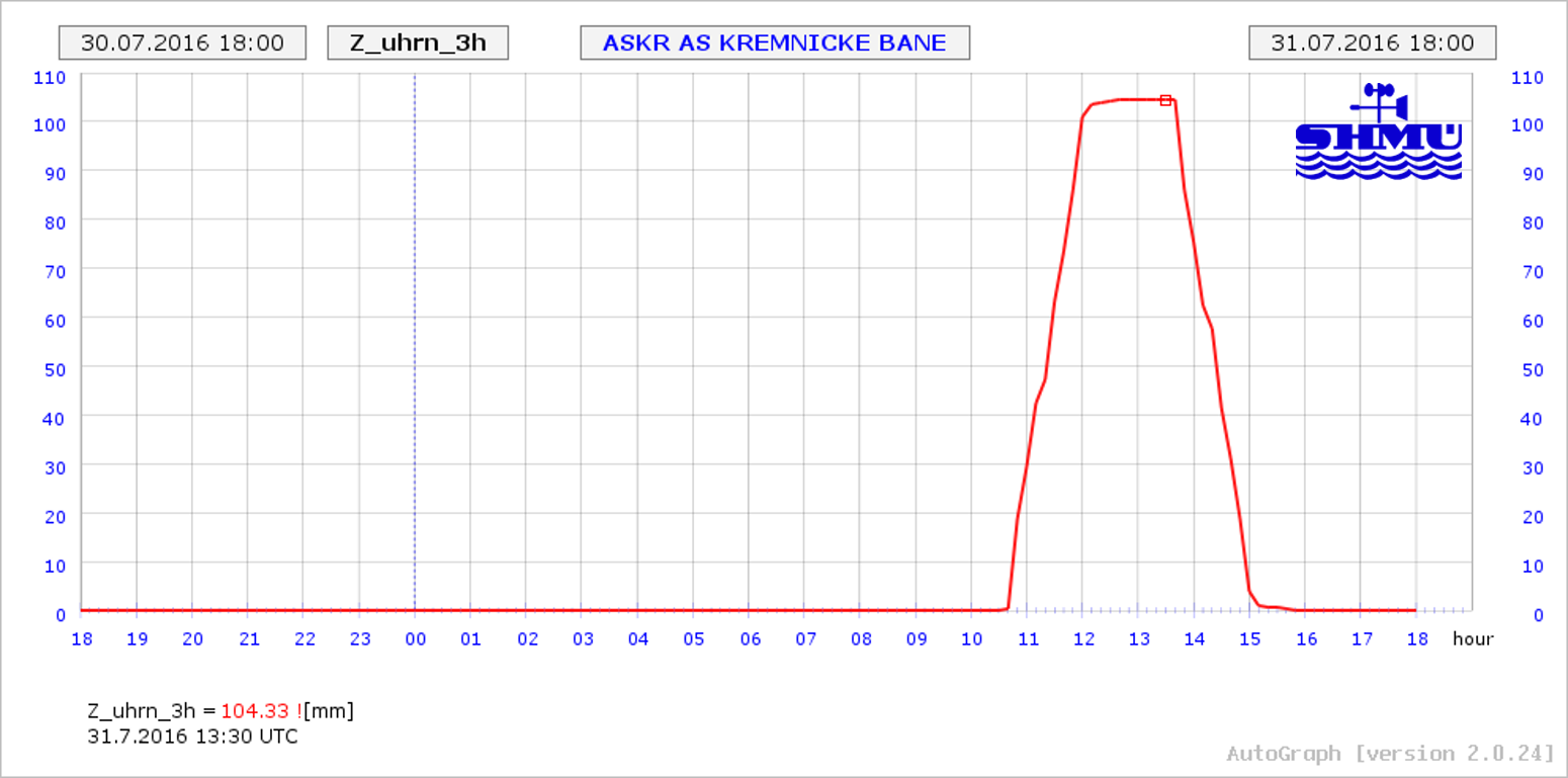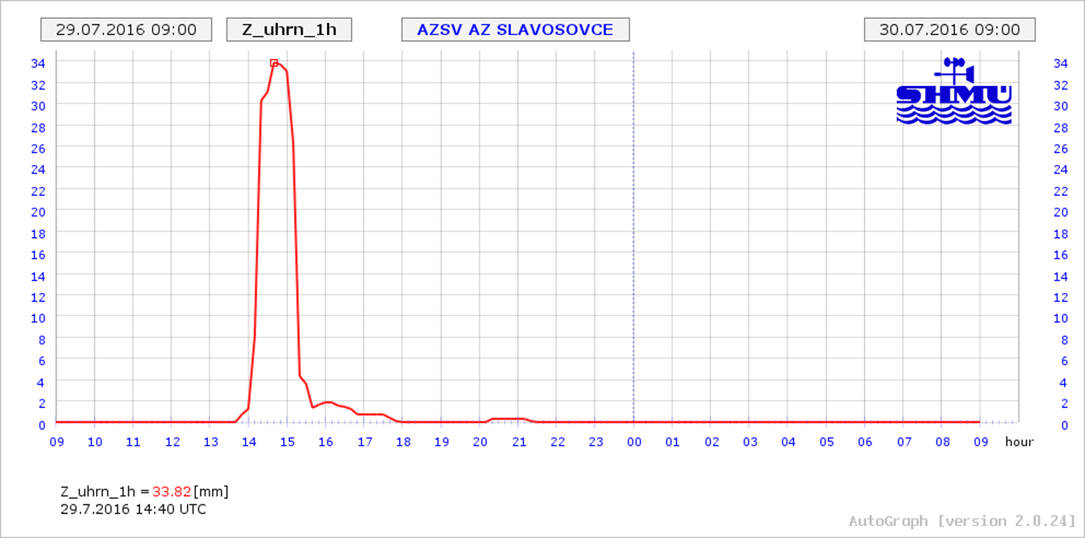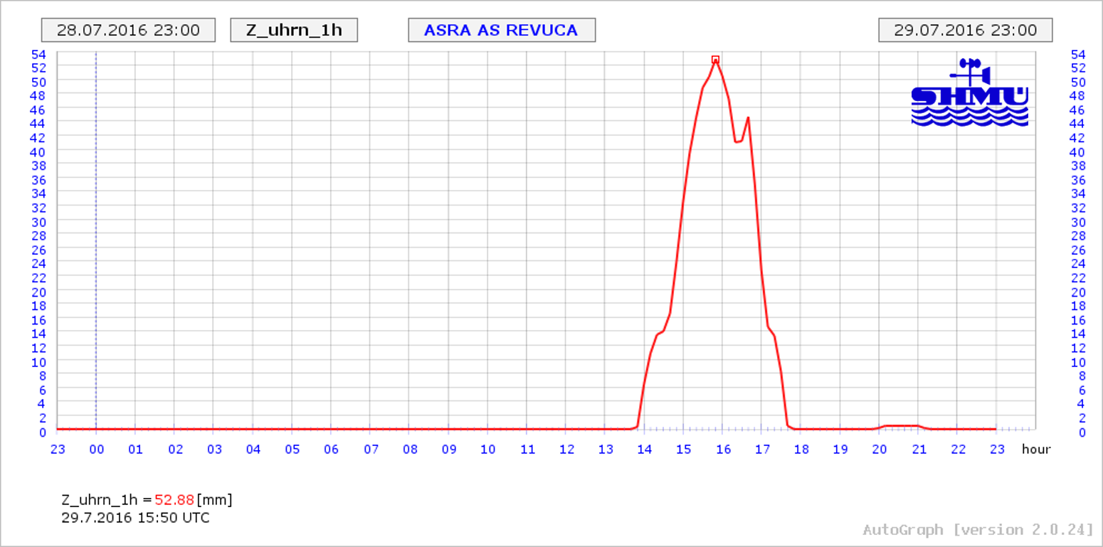 Obr. 3: Najvyšší hodinový a polhodinový úhrn zrážok na staniciach SHMÚ v období od 25.7 do 31. 7. 2016