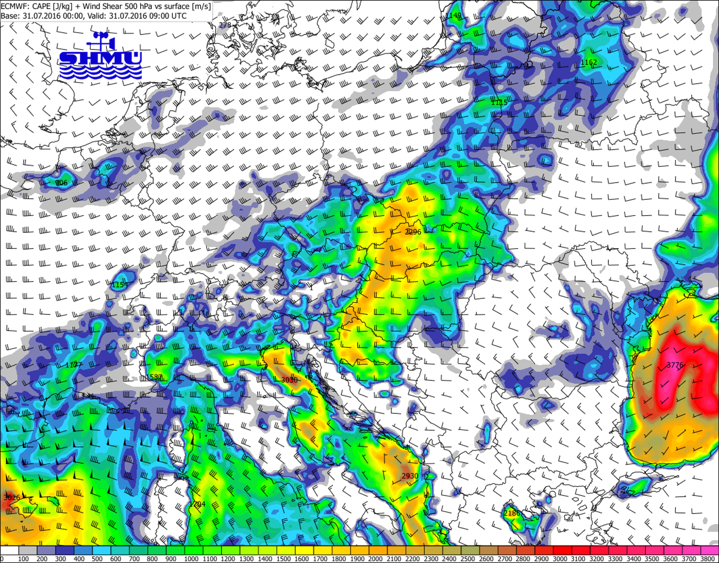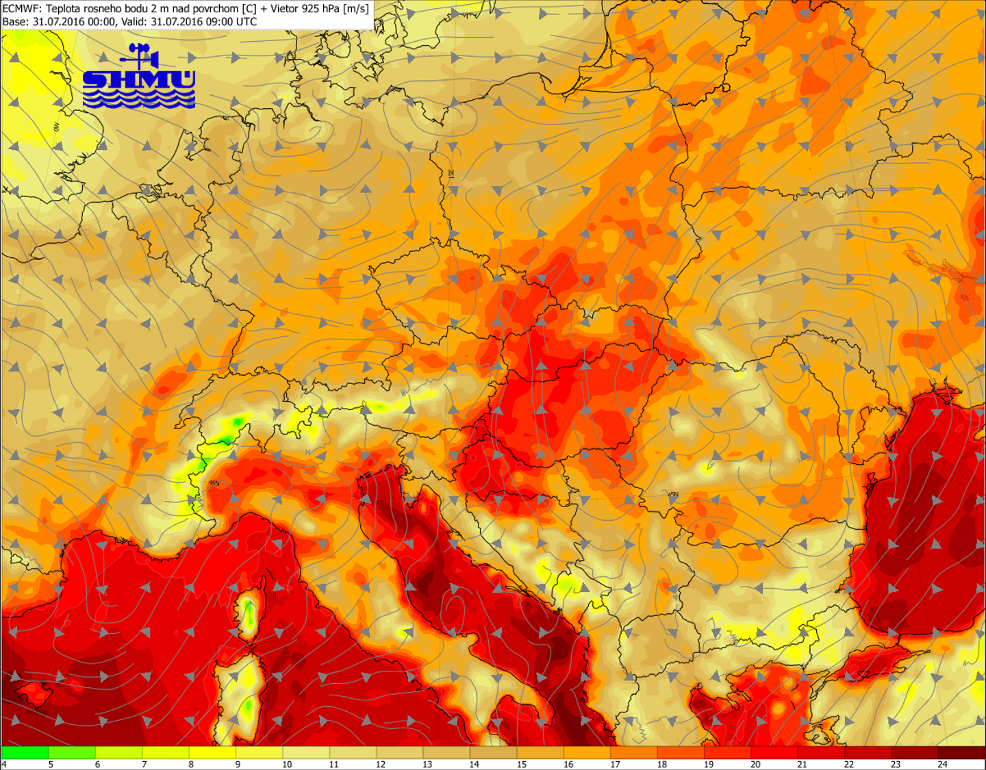 Obr. 7: Predpoveď teploty rosného bodu a vetra v hladine 925 hPa (cca 800 m n. m.) dňa 31.7. o 14:00 LSEČ