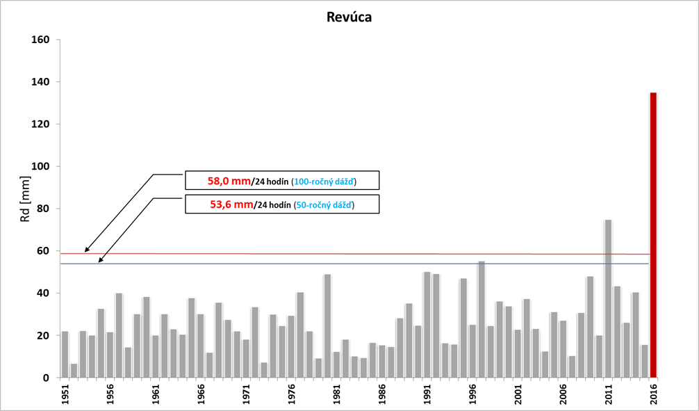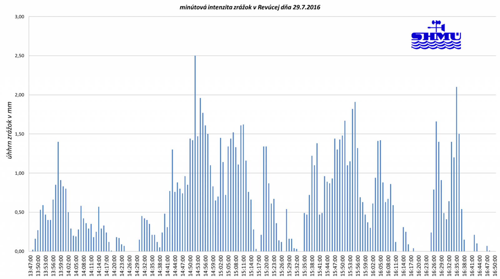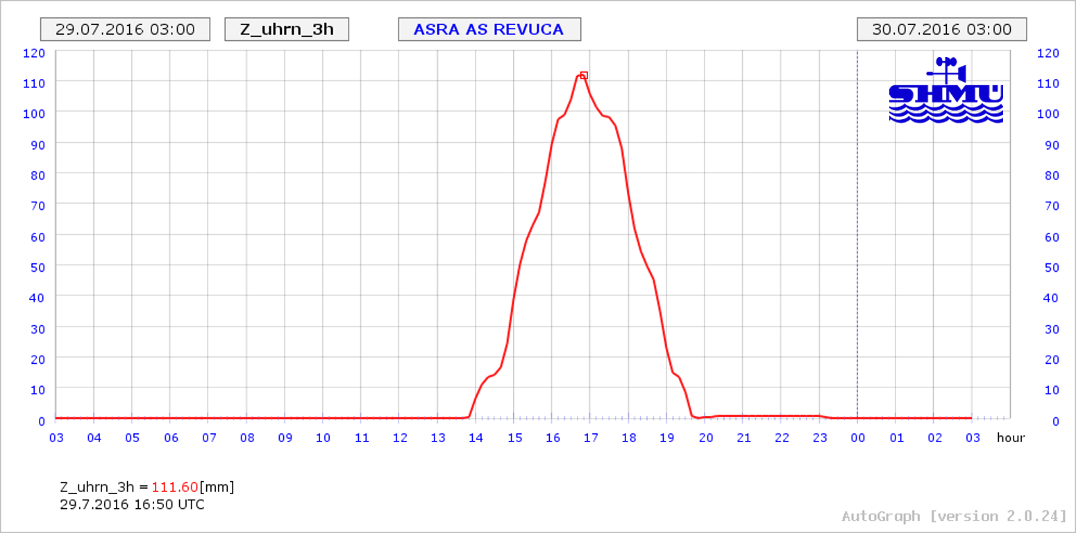 Po prechode studeného frontu vo štvrtok 28.7 sa dusno na našom území síce čiastočne zmiernilo, no ešte aj v piatok 29.7 sa na juhu stredného a na juhovýchode Slovenska udržiaval vlhký vzduch, čo dokumentujú vysoké hodnoty teploty rosného bodu (obr. 4). Hodnoty energie instability - CAPE, ale tiež predpovedaný strih vetra (pre uvedené obdobie) si môžete pozrieť TU. Podmienky na tvorbu intenzívnych búrok tak na našom území pretrvávali, pričom impulz k ich vzniku podporil aj studený front postupujúci cez Poľsko ďalej na východ. Intenzívnym a výdatným zrážkam, ktoré v Revúcej začali o 15:48 a skončila o 18:48 LSEČ, predchádzala búrková činnosť v severovýchodnej časti Stolických vrchov a Revúckej vrchoviny, ako aj vo Volovských vrchoch (animácia družicových záberov - MSG Near Natural). V obci Slavošovce spadlo za hodinu 34 mm zrážok. Následne došlo k vzniku takmer stacionárnej a takmer na rovnakom mieste regenerejúcej sa konvektívnej bunky v oblasti medzi obcami Mokrá Lúka a Muráň (animácia radarových odrazivostí - Kojšovská hoľa CAPPI 2 km). V meste Revúca, ktoré leží medzi spomínanými obcami, má SHMÚ k dispozícii údaje z dvoch zrážkomerných staníc. Na automatickej zrážkomernej stanici na severnom okraji mesta Revúca spadlo za 3 h (mm/3 h, mm/1 h) takmer 112 mm zrážok (čo približne zodpovedalo dennému úhrnu zrážok na tejto stanici) . Prehľad priebehu zrážkovej udalosti z Revúcej je možné detailne vidieť na obr. 5, na ktorom sú znázornené minútové úhrny zrážok. Na zrážkomernej stanici umiestnenej v centre mesta v blízkosti toku Zdychava spadlo za 3 h až 127 mm (za 24 h 133 mm), čo je ďaleko najvyšší denný úhrn v júli v tejto lokalite aspoň od roku 1951, a a zodpovedá približne 200 až 500 ročným zrážkovým úhrnom (Ide teda o úhrn, ktorý sa teoreticky vyskytuje raz za 200-500 rokov - táto informácia slúži najmä na ilustráciu toho, o akú mimoriadne odľahlú hodnotu v skutočnosti ide; obr. 6).