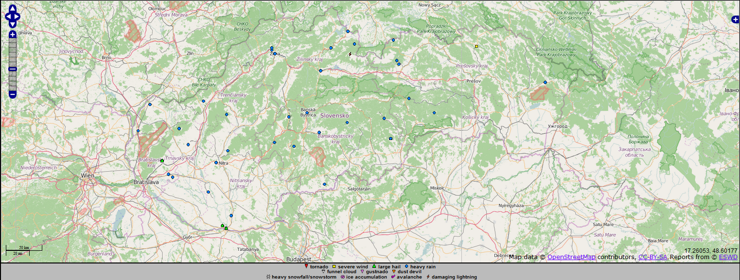 Obr. 11: Záznamy nebezpečných prejavov počasia v období od 25.7.2016 do 31.7.2016, väčšinou silný dážď (viac na www.eswd.eu).