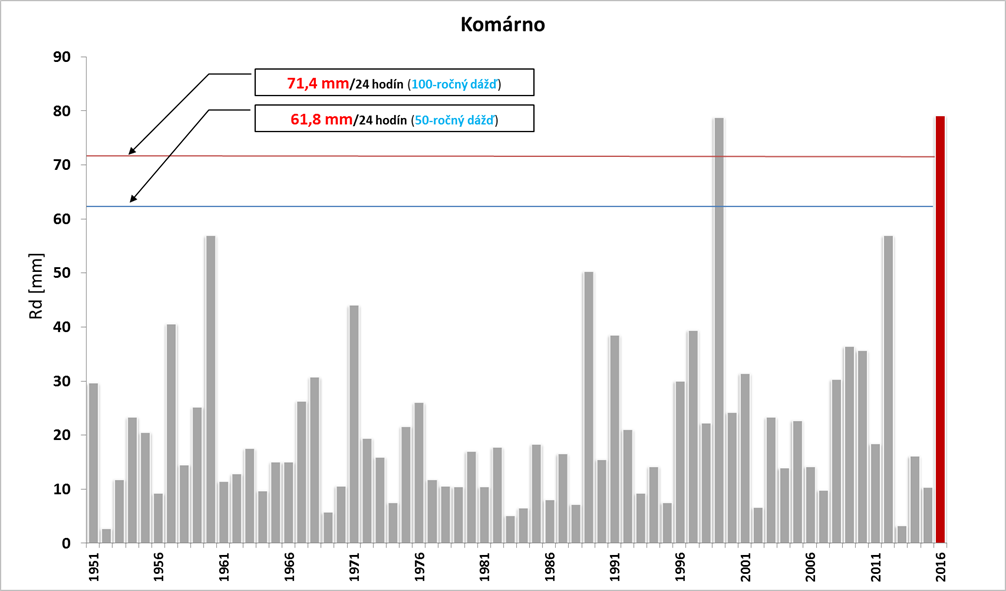 Intenzívne zrážky, krupobitie, ale aj silný vietor priniesla aj búrka v Komárne a blízkom okolí. Na animácií radarových odrazivostí možno pozorovať niektoré radarové črty supercely. Zrážkomerná stanica v Hadovciach (severozápadne od Komárna) namerala úhrn zrážok 47 mm/1 h. Večer a v priebehu noci postupoval cez naše územie studený front, na ktorom sa vytvorila výrazná línia búrok, ktorá zasiahla opäť aj Komárno. Úhrn za 24 h tak na tejto stanici dosiahol až 79,1 mm. Ide o najvyšší denný úhrn zrážok v tejto lokalite aspoň od roku 1951 (obr. 10). Treba súčasne aj pripomenúť, že oveľa vyššie úhrny boli v tento deň zaznamenané na maďarskej strane, v meste Komárom. Podľa operatívnych údajov tam denný úhrn vysoko presiahol hodnotu 170 mm (pravdepodobne aj viac ako 200 mm).