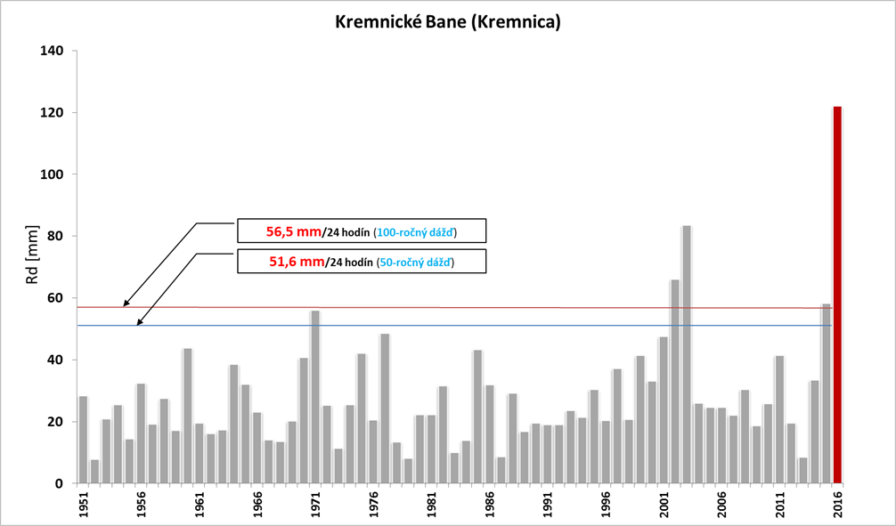 Extrémne úhrny zrážok v Kremnických Baníach a Komárne