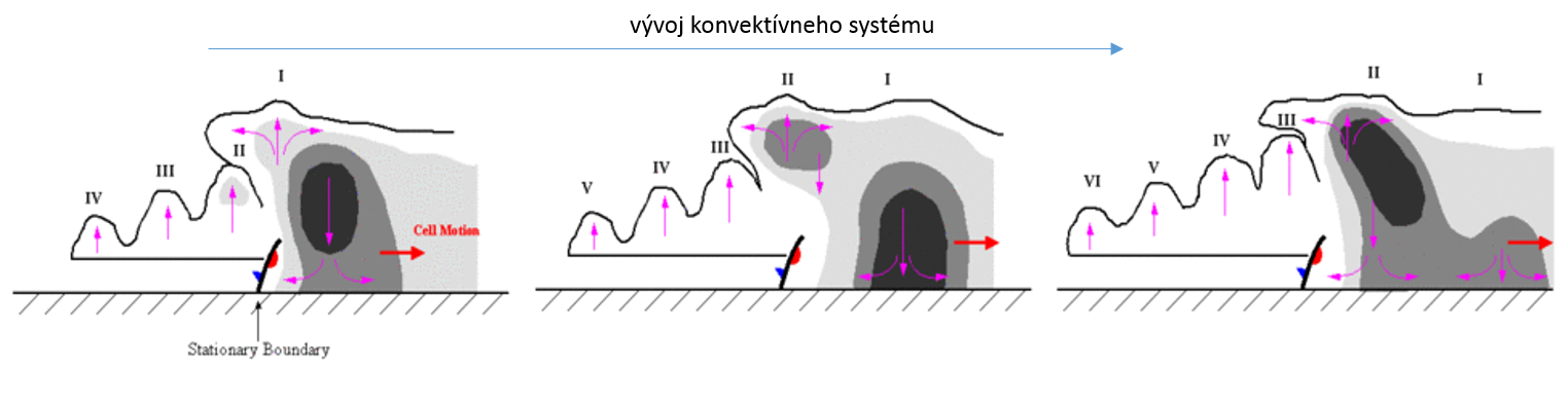 Obr. 1: Schematické znázornenie troch etáp vývoja multicelárneho systému. Jednotlivé bunky sú označené písmenami A až E. Fialové šípky znázorňujú výstupné a zostupné prúdy, divergenciu prúdenia na vrchole konvektívnej bunky, resp. pri zemskom povrchu. Symbol studeného frontu lokalizuje výskyt čela studeného výtoku z konvektívnej bunky. Pohyb jednotlivých buniek je označený červenou šípkou (pohybujú sa zľava doprava). Plochy s odtieňom sivej farby predstavujú radarovú odrazivosť v dBZ [5]