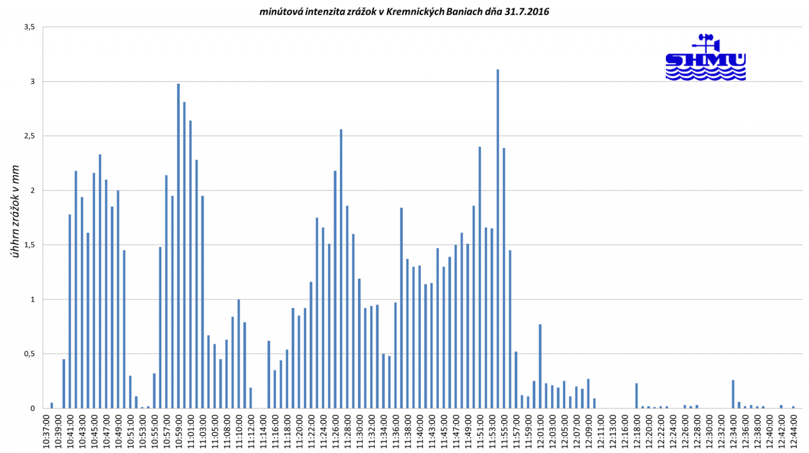 Po prechode studeného frontu v piatok 29.7 prenikol na naše územie prechodne o niečo suchší vzduch a sobota 30.7 tak bola jediným dňom v poslednom júlovom týždni, kedy sme nezaznamenali žiadne výrazné úhrny zrážok. Avšak vo večerných hodinách začal na naše územie opäť prúdiť teplejší a hlavne vlhký vzduch od juhozápadu. Teplá a vlhká vzduchová hmota sa nad naším územím udržiavala ešte aj v nedeľu 31.7. (obr. 7). Posledný júlový deň tak bolo opäť na viacerých miestach nášho územia dusno a pred studeným frontom, ktorý postupoval cez strednú Európu ďalej na východ, sa tak znova vytvorili priaznivé podmienky pre vznik intenzívnych búrok. Hodnoty CAPE, a tiež predpovedaný strih vetra je možné vidieť TU. Tvorbu kopovitej oblačnosti sme na záberoch z družice mohli pozorovať už predpoludním (animácia družicových záberov - MSG Near Natural) a krátko popoludní vznikli prvé intenzívne búrky. Pozornosť najviac pútala búrková činnosť v oblasti Kremnických vrchov, a tiež v Komárne. Intenzívny dážď zasiahol aj meteorologickú stanicu v Kremnických Baniach. Z údajov o minútových úhrnoch zrážok vidieť, že celá zrážková udalosť začala o 12:38 a skončila o 14:44 LSEČ, pričom intenzívne zrážky trvali do 13:57 h. Počas tohto časového intervalu sa vyskytli spolu štyri kratšie trvajúce obdobia, počas ktorých zrážky dosiahli intenzitu prívalového dažďa (2 a viac mm za 1 min). V nasledujúcich minútach mal dážď miernu intenzitu a postupne ustával (obr. 8). Na animácií poľa radarových odrazivostí nie je možné presne určiť o aký typ konvektívneho systému sa jednalo, tak ako to vysvetľujeme v teoretickej časti analýzy. Denný úhrn zrážok na tejto stanici dosiahol až 122 mm, pričom za hodinu tu spadlo až 72 mm (mm/1h, mm/3 h). Opäť tak ide o extrémne vysoký denný úhrn, ktorý sa v tejto oblasti nevyskytol minimálne od roku 1951 (obr. 9).
