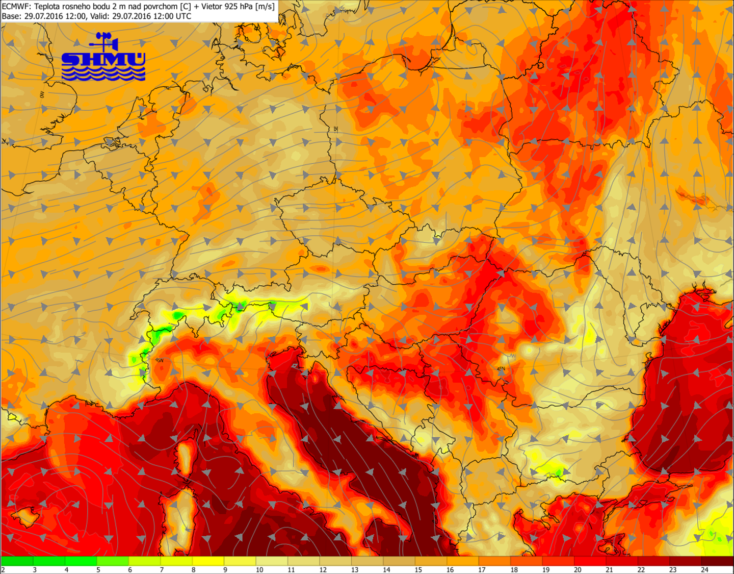 Obr. 4: Predpoveď teploty rosného bodu a vetra v hladine 925 hPa (cca 800 m n. m.) dňa 29.7. o 14:00 LSEČ