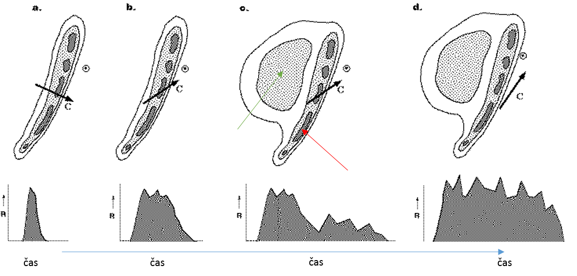 Obr. 2: Schéma znázorňujúca jednotlivé typy konvektívnych systémov s rôznym smerom pohybu a rôznou intenzitou zrážok v mieste pozorovania (krúžok s bodkou). Šrafážou je odlíšená radarová odrazivosť (tmavšia - vyššia radarová odrazivosť). V prvom prípade konvektívna línia postupuje kolmo na smer postupu a zrážky sú intenzívne, no krátko trvajúce. V druhom prípade sa línia pohybuje rovnobežne so smerom línie a zrážky tak trvajú dlhšiu dobu. V treťom prípade sa spolu s líniou pohybuje aj oblasť vrstevnatých (stratiformných) zrážok, pohyb je rovnaký ako v druhom prípade a po intenzívnom daždi nasleduje dážď s nižšou intenzitou. V poslednom prípade je systém rovnaký ako v treťom prípade, ale smer pohybu je takmer rovnobežný so smerom línie. Grafy v dolnej časti obrázku naznačujú časovú závislosť intenzity zrážok v danom bode. Červená šípka znázorňuje aktívnu oblasť konvektívneho systému, kde pozorujeme vysokú bleskovú aktivitu a výdatnejšie zrážky. Zelená šípka označuje oblasť stratiformných zrážok s nižšou intenzitou [5]