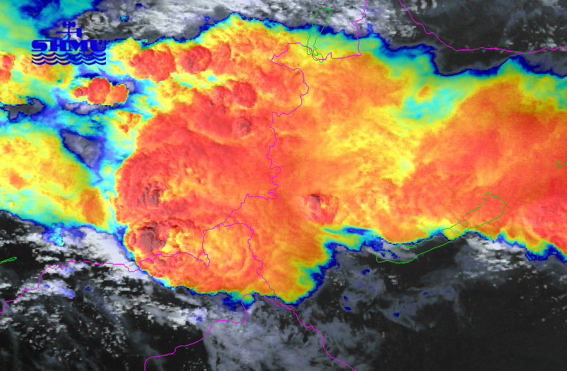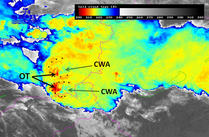 - Overshooting tops (OT) - prestreľujúce vrcholky (na obr. tmavočervené oblasti),