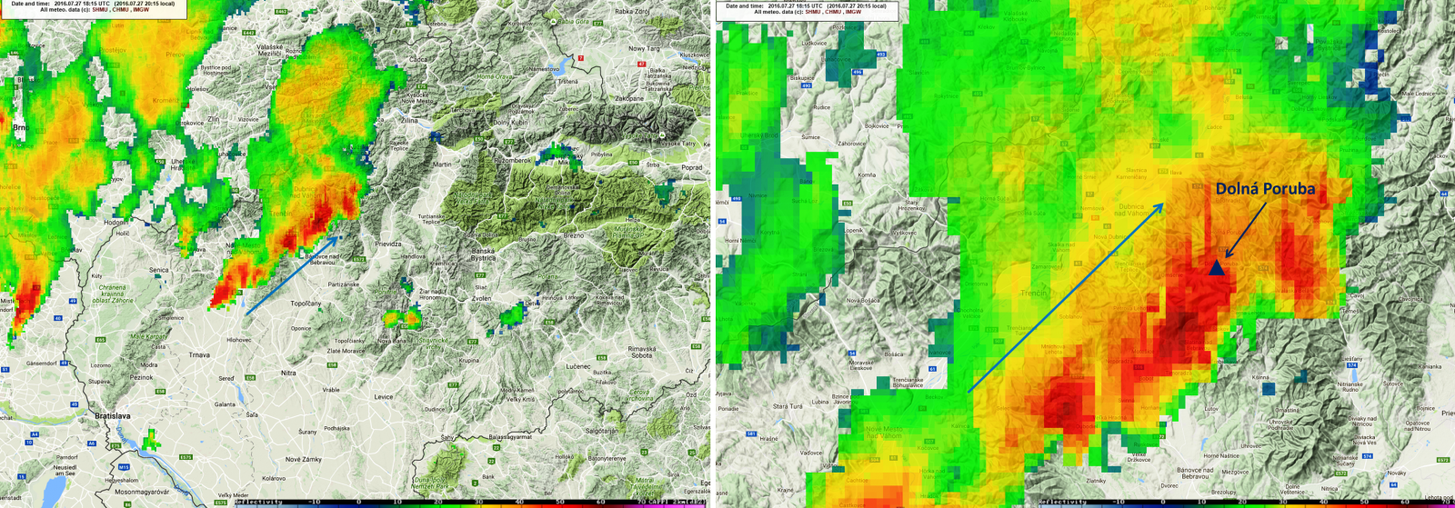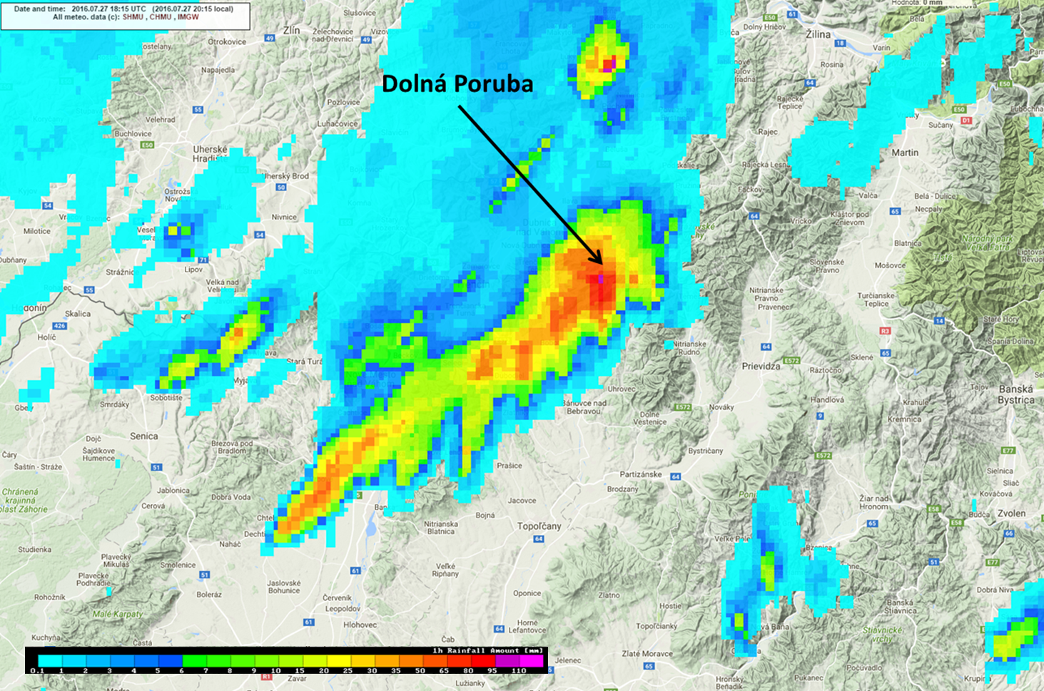 Ako vidieť na priloženom zázname staničného ombrografu (Obr. 1), dážď padal v čase medzi 19:00 a 19:30 hod. s výdatnosťou aj viac ako 3 milimetre za minútu. Maximálna radarová odrazivosť (CMAX, Obr. 2) a odhad hodinového úhrnu zrážok (Obr. 3) poukazujú na vysokú intenzitu zrážok, ktoré vypadávali z pomerne rozsiahleho konvektívneho systému, pomaly sa pohybujúceho cez predmetnú oblasť smerom na severovýchod (vidieť aj na záberoch družice NOAA v čase o 16:00 hod. UTC). Na mimoriadnosť polhodinového úhrnu z Dolnej Poruby poukazuje tiež graf na Obr. 4, kde sú vyznačené maximálne (vypočítané) intenzity krátkodobých (5 až 180-minútových) dažďov a zmerané historické maximá denného, mesačného a ročného úhrnu na Slovensku. Pre porovnanie sú vynesené aj historické extrémy vybraných intenzít vo svete (modré body; Zdroj: WMO). Polhodinový úhrn z 27. júla 2016 významne prevyšuje maximum 30-minútového dažďa pre Slovensko, ktoré je podľa Šamaj a Valovič (1973) stanovené na 66 mm. Už táto hodnota by v prípade Dolnej Poruby predstavovala denný úhrn s pravdepodobnosťou opakovania raz za 200 až 500 rokov.