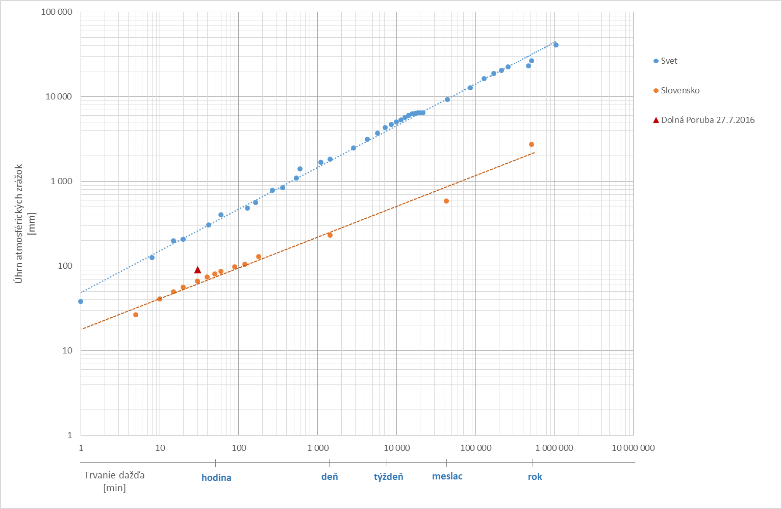 Obr. 4: Obalové krivky maximálnych intenzít dažďa [mm] pre vybrané trvania zrážok [min] na svete podľa WMO a na Slovensku (5 až 180 minút podľa Šamaj a Valovič, 1973; 1 deň a viac – maximálne úhrny namerané v sieti meteorologických staníc SHMÚ) – úhrn zrážok za 30 minút z Dolnej Poruby (91,0 mm/30 min) je zvýraznený červeným symbolom