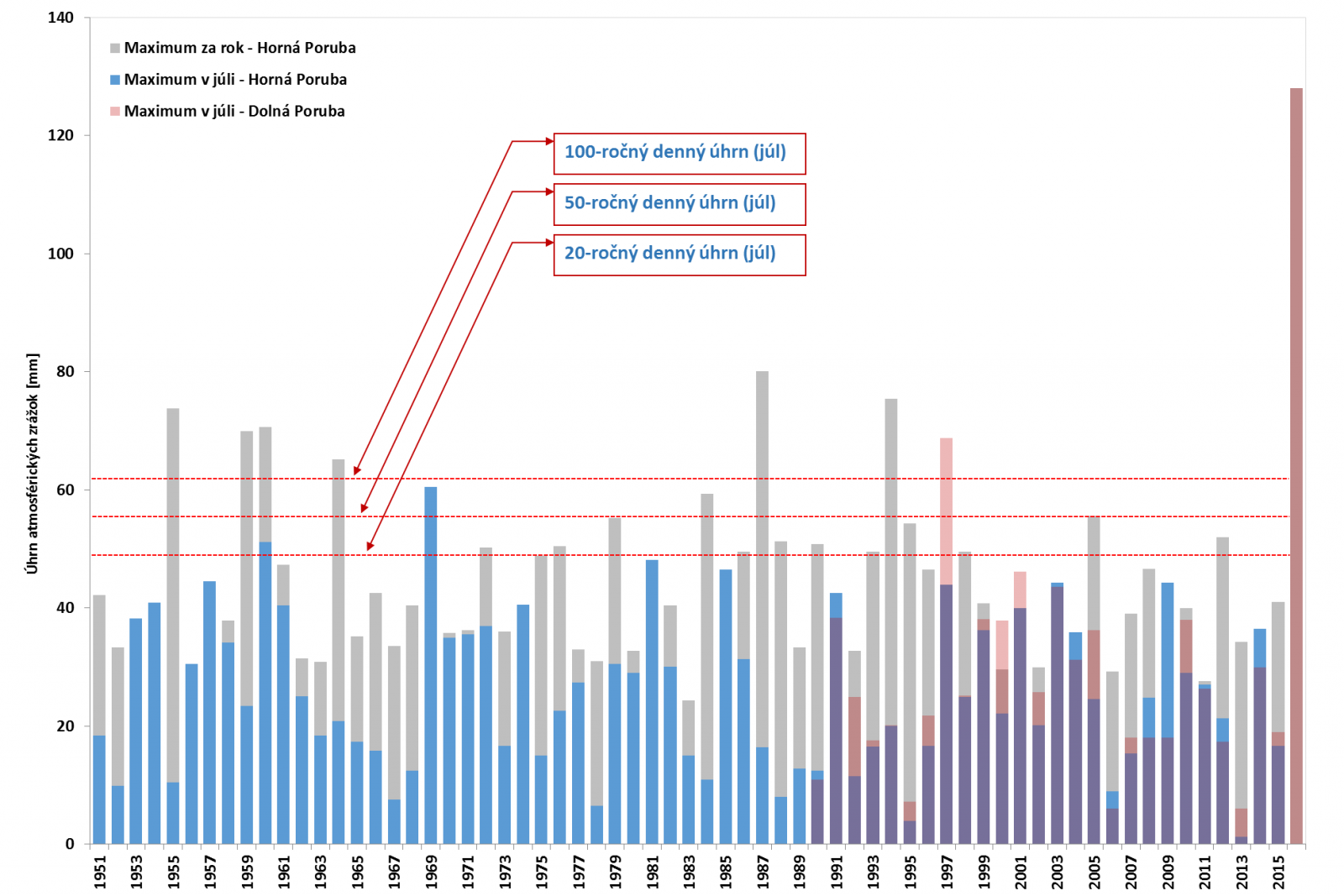 Z pohľadu frekvencie výskytu mimoriadnych zrážok a ich klimatickej zabezpečenosti je preto možné hodnotu 91,0 mm/30 min považovať za veľmi odľahlú hodnotu, ktorej n-ročnosť sa dostupnými štatistickými metódami nedá spoľahlivo odhadnúť pre časové rady kratšie ako 30 rokov. Predpokladáme však, že ide o úhrn s priemerným výskytom raz za viac ako 1000 rokov. V tejto súvislosti pre zaujímavosť uvádzame aj porovnanie maximálneho denného úhrnu zrážok z kombinovaného historického radu zo staníc Dolná Poruba (1990 – 2016) a Horná Poruba (1951 – 2015) (Obr. 5). V grafe sú, okrem maximálneho denného úhrnu v júli a za rok, zobrazené aj hodnoty 20-, 50- a 100-ročného denného úhrnu zrážok. Z obrázku vidieť, že maximálny denný úhrn v júli na stanici Horná Poruba sa k „storočnej“ hodnote zabezpečenosti priblížil najviac v roku 1969 (60,5 mm), resp. v Dolnej Porube ju od roku 1990 presiahla len jedenkrát, a to v roku 1997 (68,8 mm).