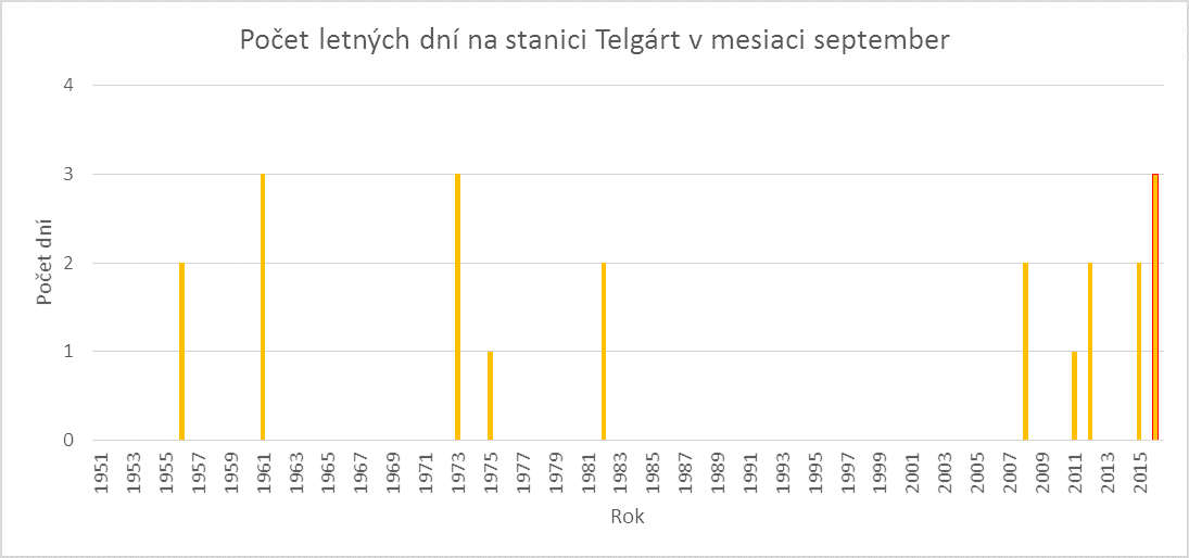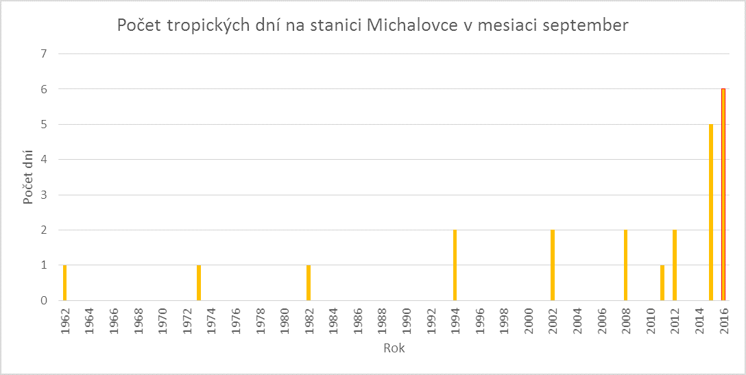 V aktuálnom septembri je v charaktere počasia veľa príznakov neskorého leta. Zvláštnosťou je aj to, že v poslednom letnom mesiaci, v auguste, bolo tento rok menej tropických a letných dní ako doteraz priebežne v septembri (Tab. 1). Mimoriadne teplé počasie v prvej polovici septembra ovplyvní počet týchto dní do takej miery, že tohtoročný september bude mať rekordný počet letných a tropických dní na niektorých meteorologických staniciach. Už do 12. 9. 2016 je to realitou napríklad v Michalovciach, kde ani raz v septembri, minimálne od roku 1962, nemali tak veľa tropických dní ako v prvom jesennom mesiaci v roku 2016 (Obr. 1). V Stropkove sú to zatiaľ tento rok 4 tropické dni, čím je už teraz vyrovnaný rekordný počet z minulého roka. Pozoruhodný je aj výskyt tropických nocí v septembri 2016. V Bratislave na Kolibe, boli do 12. septembra 2016 zaregistrované už dve, pričom v septembri sa tam nikdy, aspoň od polovice 20. storočia tropické noci nevyskytli. Letné dni v stredných horských polohách sa v prvej tretine jesene u nás môžu vyskytovať, ale teraz ich je v septembri veľmi veľa. Príkladom je meteorologická stanica Telgárt, kde zaznamenali už do 12.9.2016, 3 letné dni a takýto počet letných dní tam bol v septembri aj v rokoch 1961 a 1973 (Obr. 2).