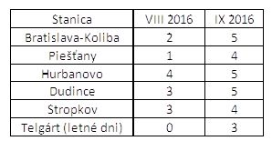 Tab.1 Počet tropických a letných dní (len stanica Telgárt) v auguste a septembri 2016 (platné do 12.9.2016)