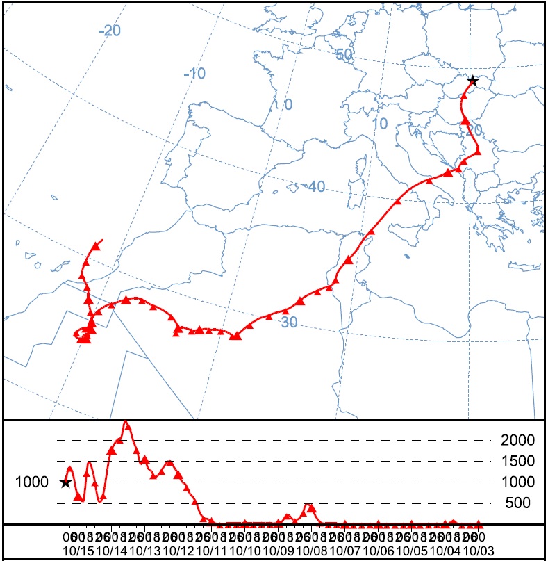 Dôkaz o pôvode saharského prachu nám opäť poskytol model HYPSPLIT, ktorý dokáže vypočítať spätnú trajektóriu atmosférického prúdenia. Dobrodružné putovanie vzduchu je znázornené na nasledujúcom obrázku.