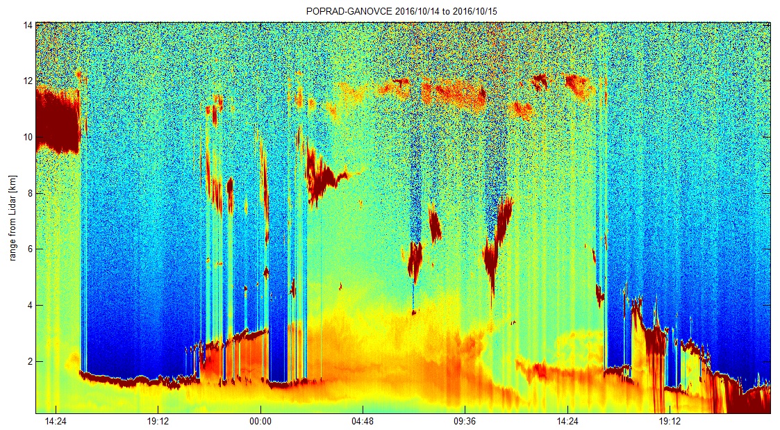 Obr. 1. Vertikálny profil aerosólov vo vybranom čase 14. – 15. októbra 2016,