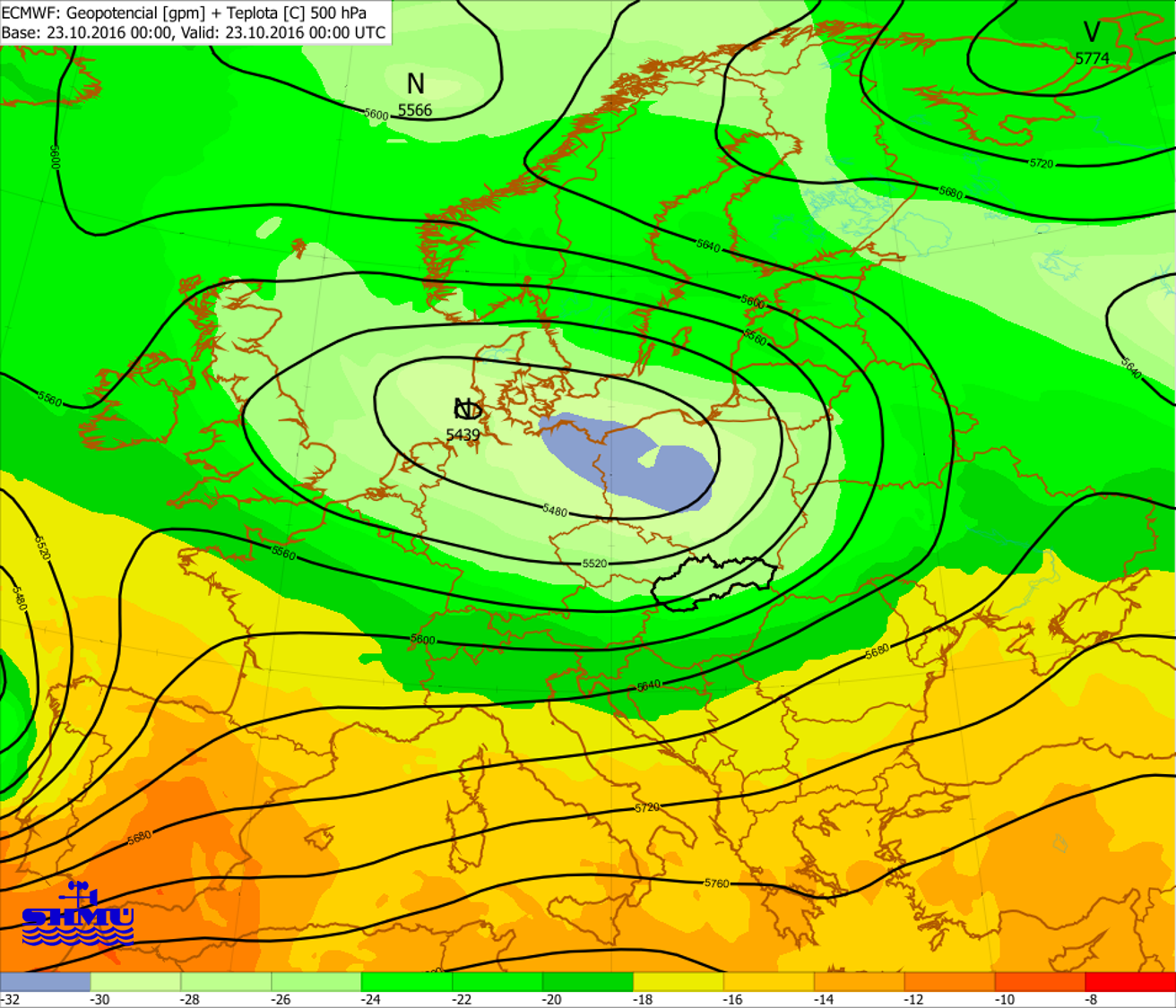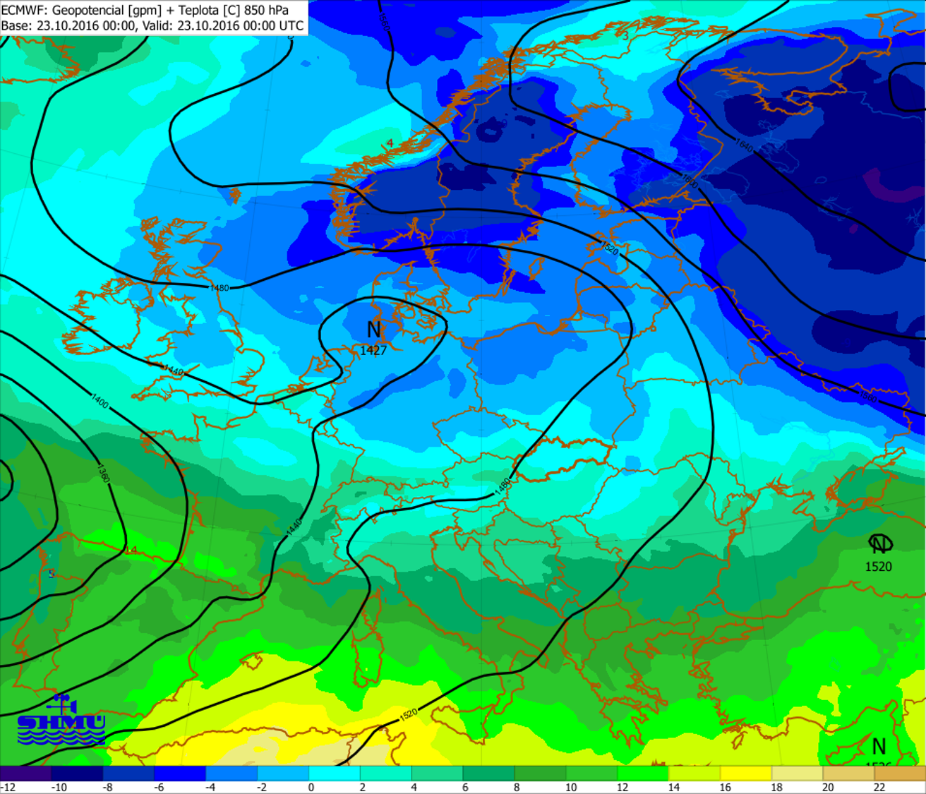V noci zo soboty na nedeľu (z 22. na 23.10.) sme vplyvom advekčného ochladzovania zaznamenali v sobotu neskôr popoludní rýchly pokles teploty vzduchu na Lomnickom štíte (obr. 1). Počas spomínanej noci klesla teplota vzduchu na tejto stanici na -8,8 °C a advekciu studenej vzduchovej hmoty vidieť najlepšie na animácii teploty vzduchu v hladine 700 hPa (nižšie). V tomto prípade však nešlo o typický príklad advekcie studenej vzduchovej hmoty za studeným frontom na zadnej strane brázdy nízkeho tlaku vzduchu alebo tlakovej níže, ale o prílev studeného vzduchu, spojeného s pomalým presúvaním tlakovej níže vo vyšších vrstvách ovzdušia so stredom nad Dánskom. Na animácii tiež vidieť, že studený vzduch (s teplotou -8 °C a nižšou) sa nad časťou nášho územia udržiaval len krátky čas a v ranných hodinách začala teplota vzduchu v tejto hladine nad naším územím stúpať.