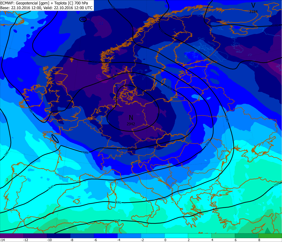 Animácia teploty vzduchu v hladine 700 hPa (približne 3000 m n. m.) podľa ECMWF (beh z 22.10. 12 UTC)