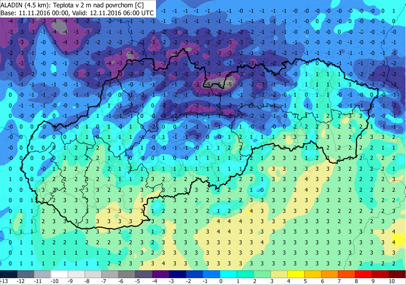 Predpoveď teploty vzduchu vo výške 2 m z modelu ALADIN na víkend 12. a 13.11.2016.