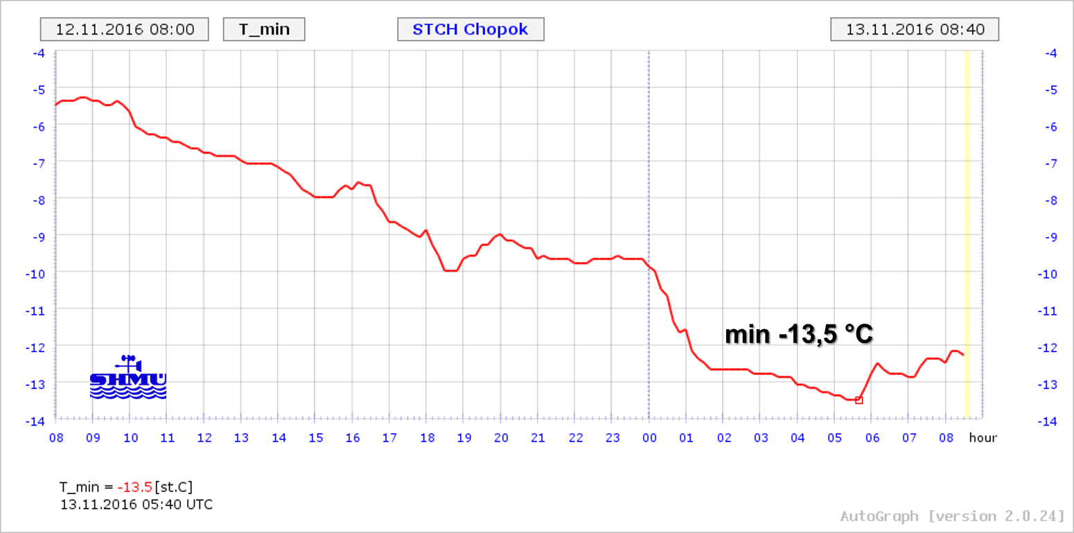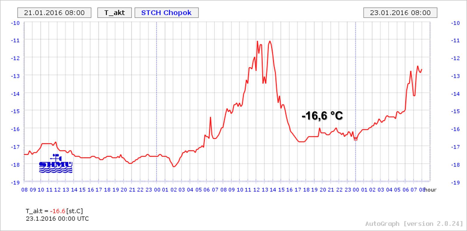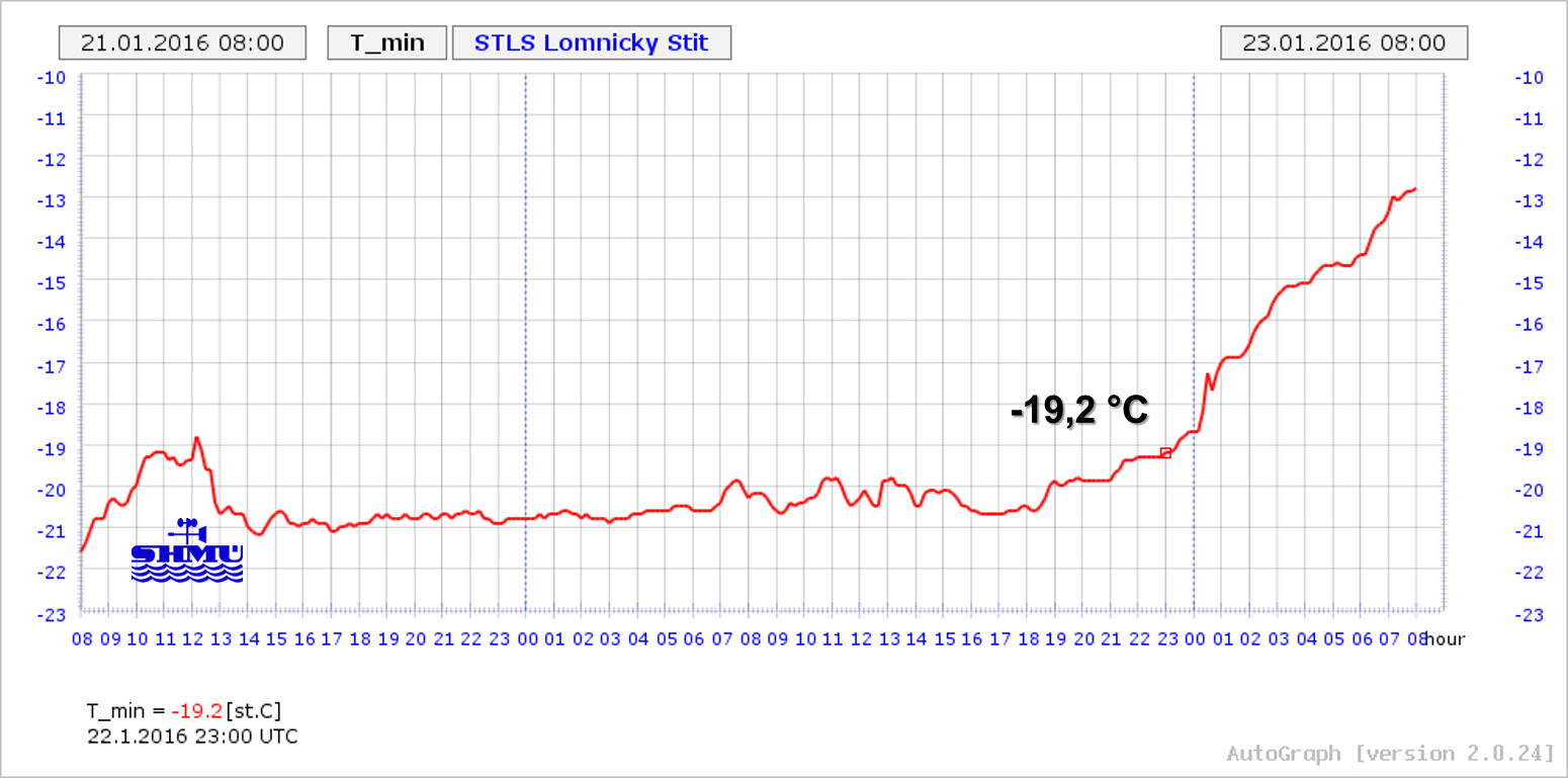 Najsilnejší vietor sme zaznamenali v oblasti Volovských, Stolických (najmä v podcelku Stolica) a Slanských vrchov a na hrebeni Nízkych Tatier. Z nižších polôh bolo najveternejšie v Košickej kotline a vo Východoslovenskej nížine, veterno bolo tiež na juhozápade územia (obr. 2). V Telgárte a v Košiciach na letisku sme v noci zo soboty na nedeľu zaznamenali prudký vietor (obr. 3 a 4). Prudký vietor sa prechodne vyskytol aj na stanici v Gánovciach, silný vietor bol aj v Trebišove a v Somotore. Víchricu sme prechodne zaznamenali len na Chopku (obr. 5). Nárazy vetra presiahli aj v nižších polohách ojedinele 80 km/h a to napríklad na košickom letisku a v Trebišove (obr. 6 a 7). Kombinácia silného vetra a nízkej teploty vzduchu výrazne znižovala pocitovú teplotu. Napríklad v Telgárte pri teplote vzduchu od -4 do -6 °C a rýchlosti vetra od 35 do 55 km/h bola pocitová teplota v rozpätí od -12 do -16 °C. Výpočet pocitovej teploty nájdete na tejto adrese.