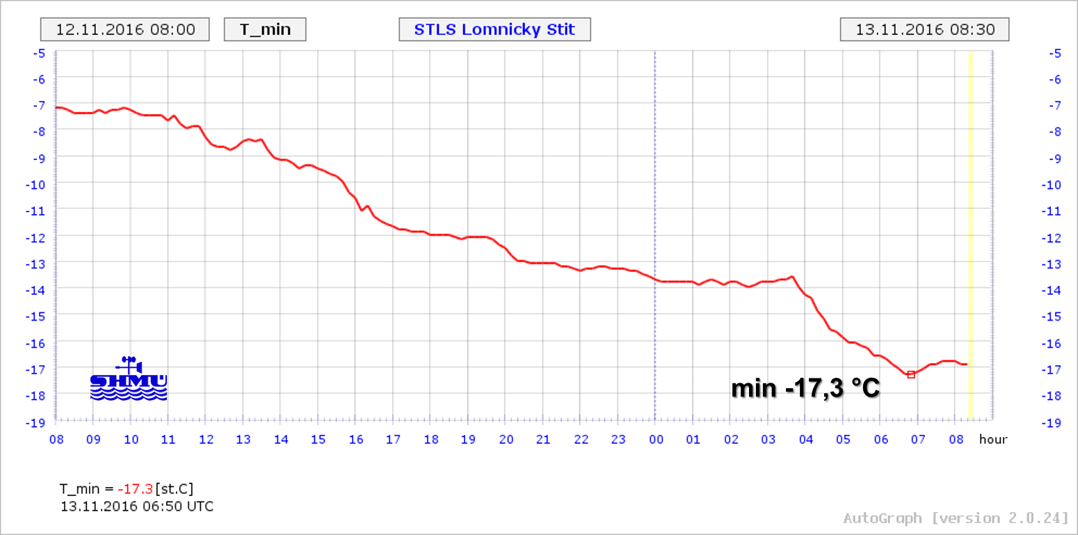 V piatok 11.11. sa južne od Álp prehĺbila tlaková níž. V sobotu sa stred tlakovej níže presunul z Jadranského mora nad Rumunsko a súčasne sa od severozápadu začala do našej oblasti rozširovať tlaková výš. V našej oblasti tak v krátkom čase vznikol výrazný gradient tlaku vzduchu (animácia). Po severnom okraji tlakovej níže začal nad naše územie prúdiť od severovýchodu studený, pôvodom arktický, vzduch. Vrchol advekcie studeného vzduchu sme zaznamenali v ranných hodinách, keď teplota v hladine 850 hPa klesla na krajnom severe prechodne na hodnoty okolo -10 °C (animácia nižšie). Na Lomnickom štíte bolo minimum teploty -17,3 °C a na Chopku -13,5 °C. Chladnejšie bolo na týchto staniciach naposledy 23. januára 2016 (Lomnický štít, Chopok). Na reanalýze teploty vzduchu v hladine 850 hPa vidieť (obr. 1), že v tom čase sa nad naším územím nachádzala vzduchová hmota s porovnateľnou teplotou ako v nedeľu ráno (porovnaj animáciu nižšie s obrázkom č. 1). Výrazný tlakový gradient v kombinácii s prílevom studeného vzduchu boli hlavnou príčinou veterného počasia, ktoré na našom území pozorujeme už približne 36 hodín. Vplyv na zosilovanie vetra mali pravdepodobne aj zložité orografické podmienky územia Slovenska.