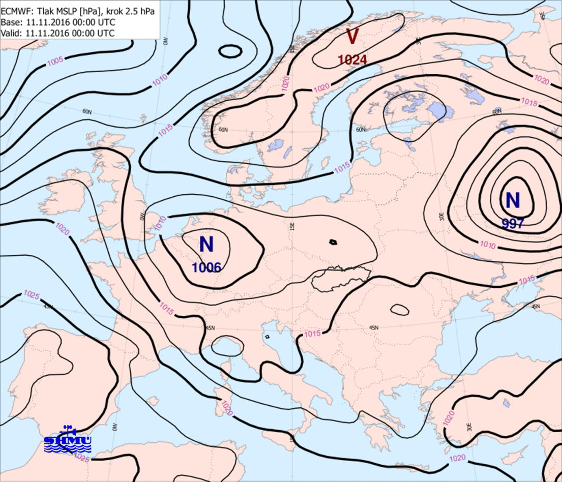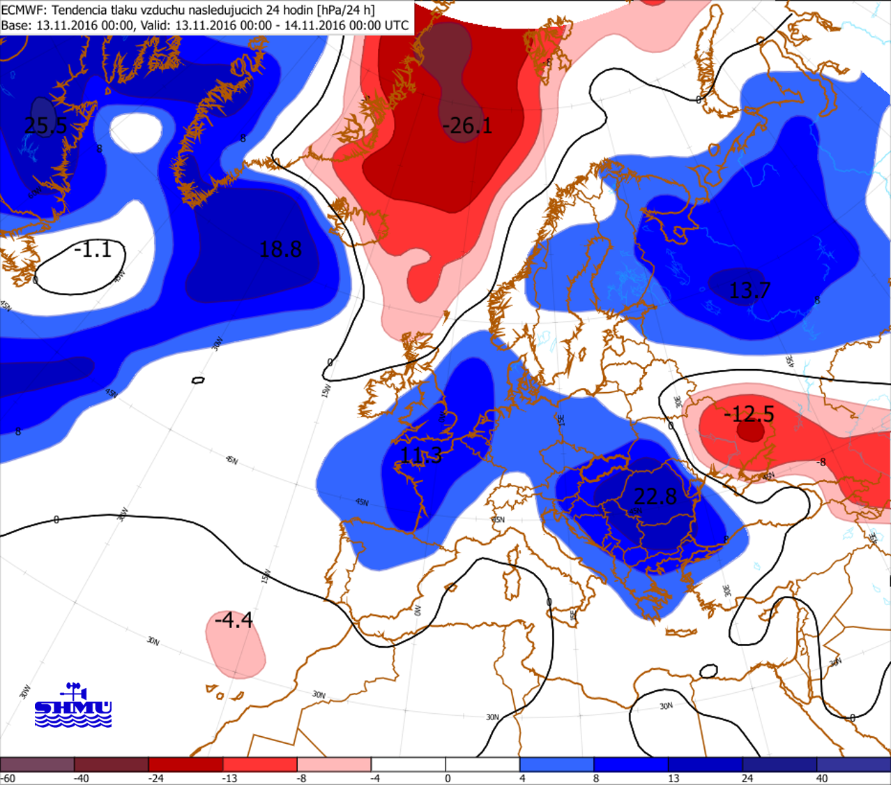 Obr. 8: 24-hodinová zmena tlaku vzduchu - predpoveď ECMWF z 13.11 o 00 UTC (modrou farbou sú znázornené vzostupy a červenou poklesy tlaku vzduchu)