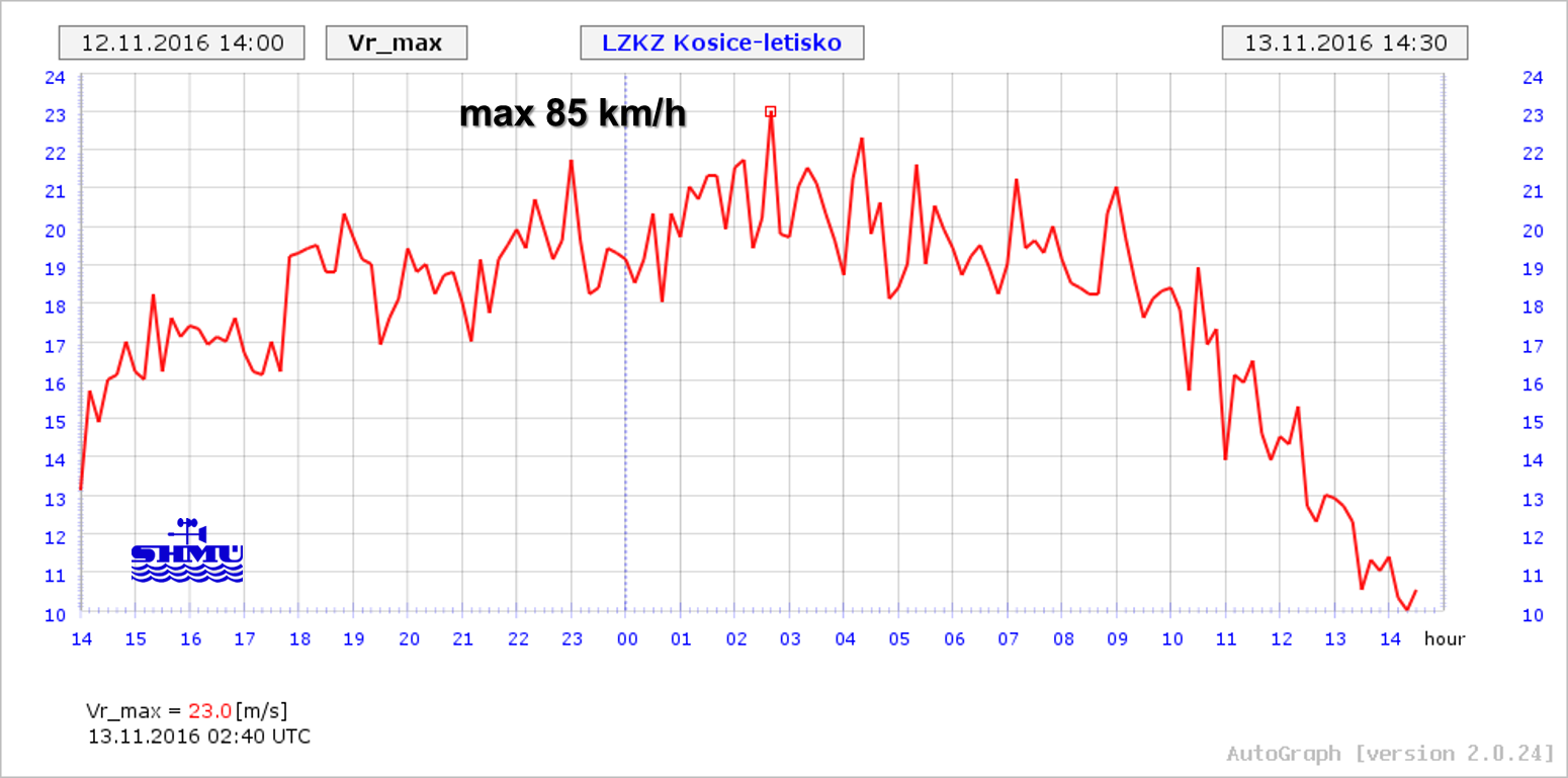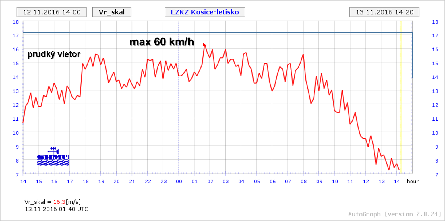 Obr. 4: Priebeh rýchlosti vetra na stanici Košice - letisko 12. a 13.11.2016